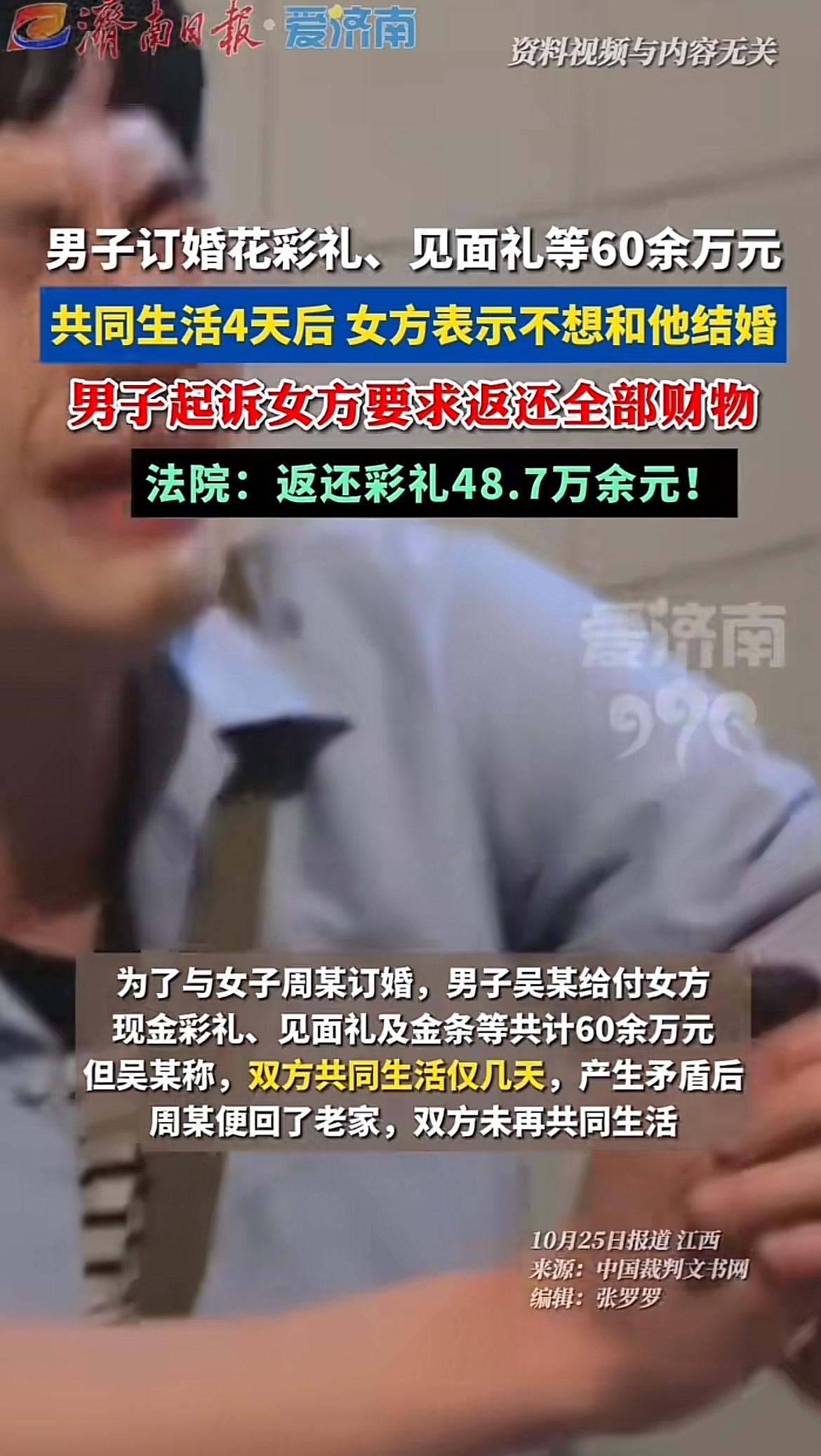 这彩礼纠纷看得人直摇头。江西的吴某为和周某订婚,给了现金彩礼、见面礼还有金条等,前前后后花了60多万。结果两人共同生活才几天,产生矛盾后周某就回老家,之后也不再一起生活。 吴某起诉到法院,想追回这些财物。法院考虑到两人共同生活时间短,又没办结婚登记,还没形成稳定的共同居住生活,就判女方返还彩礼的90%,也就是48.7万余元。60多万不是小数目,这对普通家庭来说得攒多久。这事儿也给大家提个醒,结婚不是小事,彩礼给出去也得谨慎。