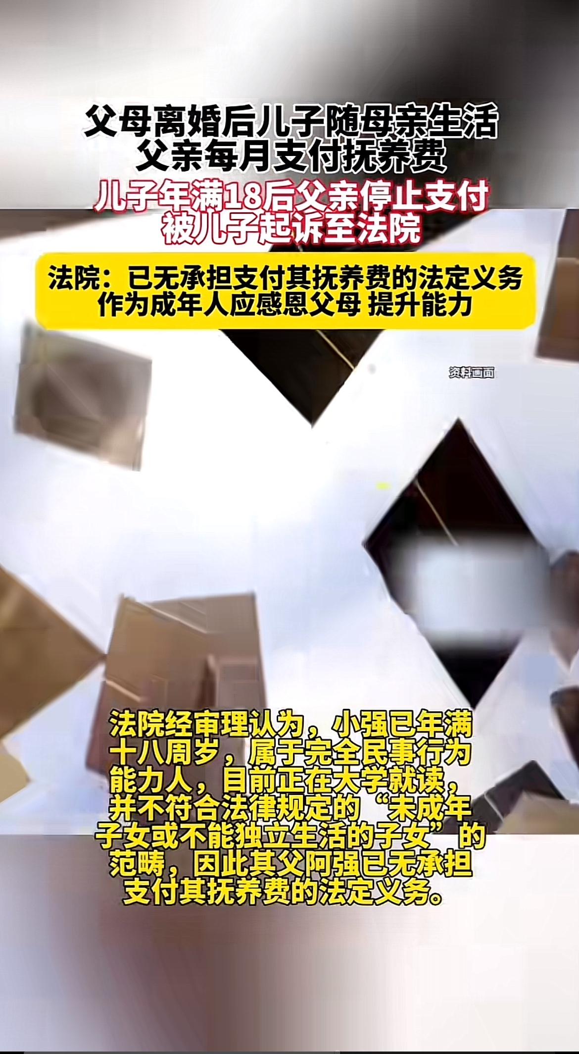 11月2日九派新闻报道了这么个事儿。2023年阿珍和阿强离婚,儿子小强随母亲生活,阿强每月付1000元抚养费,还承担了部分大学学费。但小强满18岁后,阿强停止支付。2024年底,小强起诉要求继续支付。 法院驳回了小强诉求,因为他已成年,不属于“未成年子女或不能独立生活的子女”,阿强没了支付抚养费的法定义务。其实一般孩子满18岁就难起诉要抚养费了,除非还在高中及以下学历教育、有残疾无法独立生活。这事儿也提醒大家,成年了也该感恩父母,自己努力提升,勤工俭学完成学业。