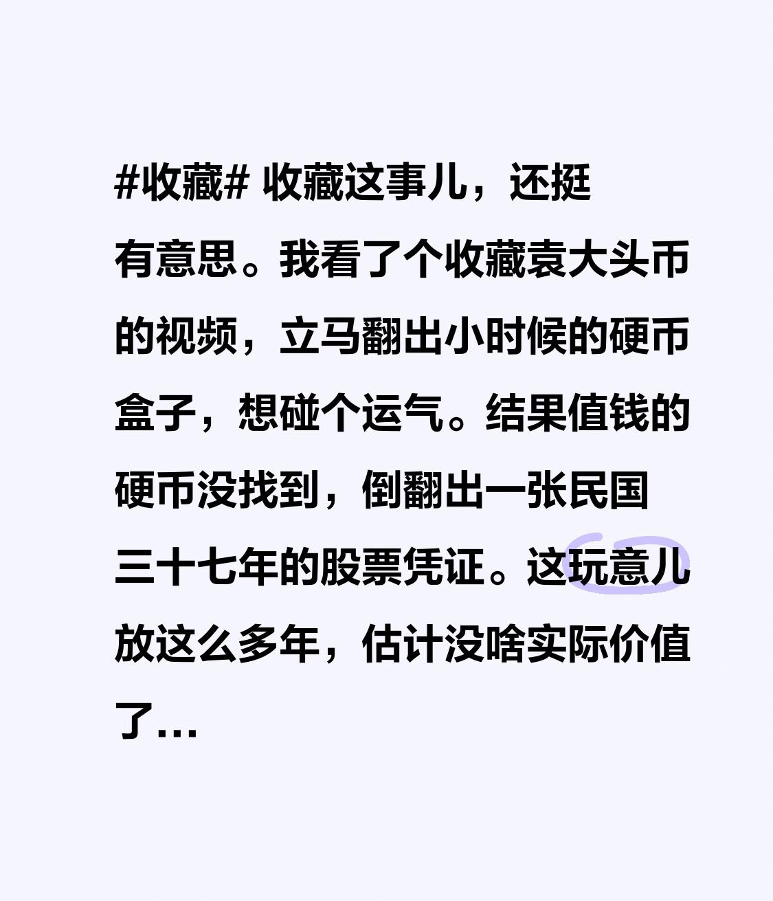收藏这事儿,还挺有意思。我看了个收藏袁大头币的视频,立马翻出小时候的硬币盒子,想碰个运气。结果值钱的硬币没找到,倒翻出一张民国三十七年的股票凭证。这玩意儿放这么多年,估计没啥实际价值了,扔了吧,毕竟是家里留下的,当个念想也好。 其实收藏的起因应该是喜爱,就像精心呵护一辈子的宝贝,哪怕离世也不交易,只做交付和传承。要是整天盯着收藏品价格,像炒理财产品一样买卖,那可就不算真正的收藏,而是掉进钱眼里啦。