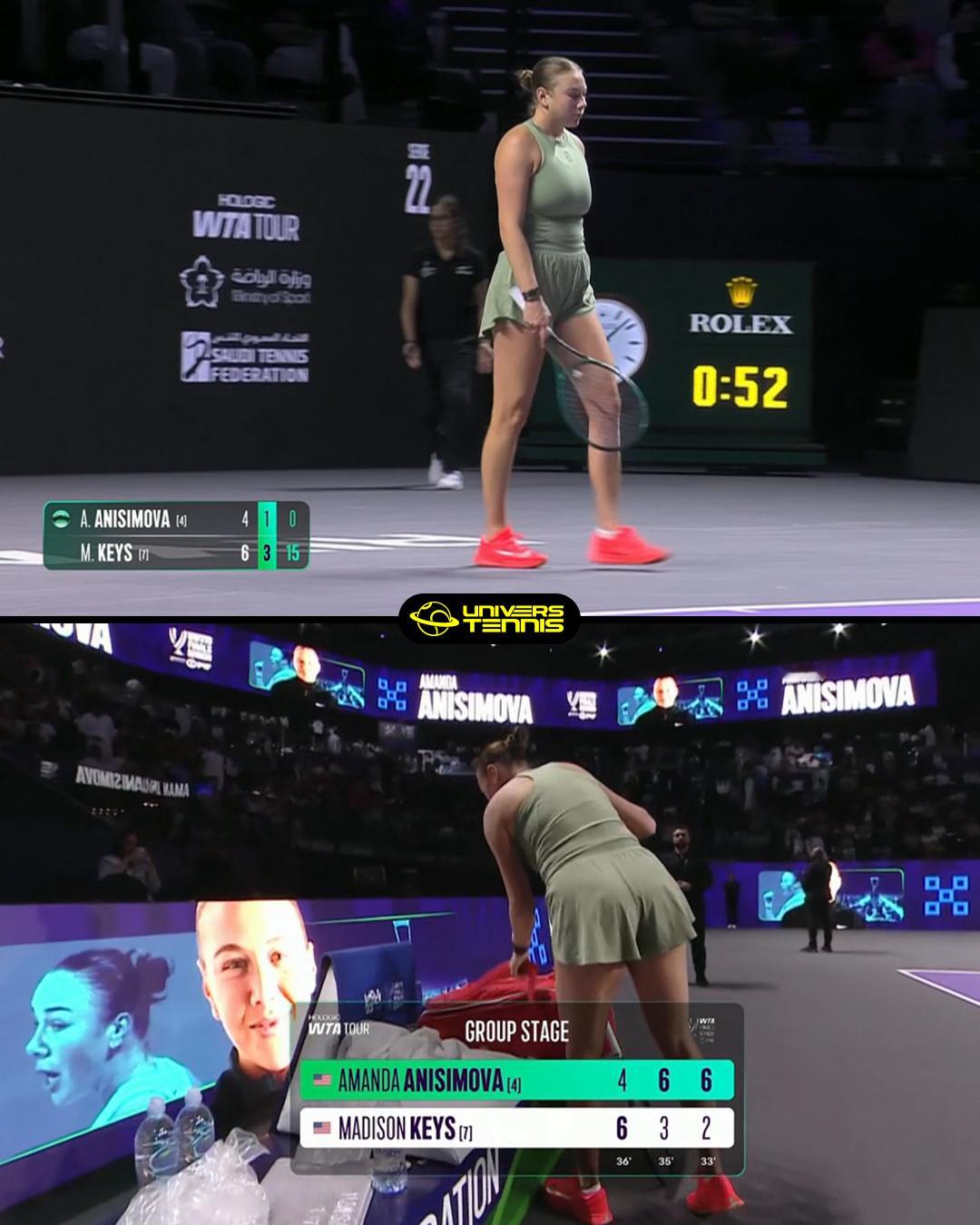 阿尼西莫娃先失一盘、次盘1-3大逆转,最终4-6、6-3、6-2击败凯斯,取得总决赛首胜,将和斯瓦泰克争夺小威组第二。