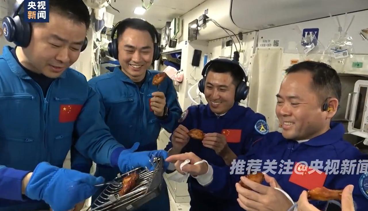 太空烧烤局的几个细节: 1、神州二十一乘组,里面还穿着特殊的衣服,注意看手腕处的细管。 2、六名航天员,应该都配有骨传耳机,吃鸡翅的时候,张陆戴的是骨传耳机;烤鸡翅的时候,陈中瑞戴的是骨传耳机,同时脖子上,还挂一个降噪耳机。 3、注意看图二,武飞左手戴的手表,肯定不是普通的手表,至于是什么手表,小编也不知道,只能确定,是黑色的,侧面有两个按钮。 还有更多细节,你发现了吗? 比如,烤鸡翅的温度是180度,时长是28分钟。 为什么是28分钟,而不是25分钟,或者30分钟呢?