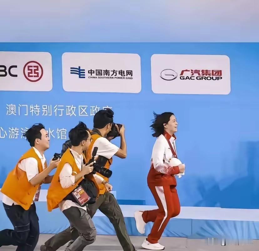 全红婵估计也没想到赛后这张照片会火出圈吧! 照片中婵宝身着红白色运动套装,带着获奖的奖牌,怀中抱着可爱的布偶娃娃,脸上洋溢着青春少年的灿烂笑容。身后三个穿着橙色背心的摄影师你追我赶,都在找最佳的拍摄角度,这像不像是另外一场场外“趣味竞赛”? 跑的人很开心,追的人也很开心,看的人也开心。这就是全妹的魅力、婵宝的笑容太有感染力了!赛场下的灵动模样和赛场上的霸气形成反差萌,难怪大家都爱她! 这张照片太治愈了!婵宝纯粹的笑容和身后“抢镜”的摄影师,完美捕捉了她赛场下邻家妹妹的真实可爱,这份不加修饰的快乐最动人。 全红婵太圈粉啦! 14岁就拿奥运金牌,跳水动作又稳又绝,像条灵活的鱼扎进水里,溅起的水花比硬币还小。平时说话耿直又可爱,采访时说“想挣钱给妈妈治病”,实在又暖心。她没有明星架子,眼里全是对跳水的认真,这种天赋加努力还接地气的小姑娘,谁能不喜欢呢!