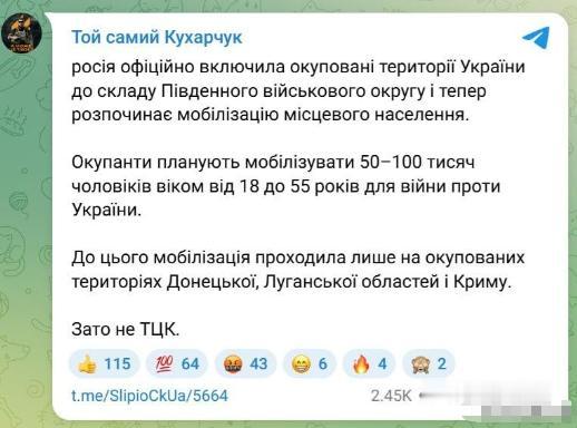 乌克兰第三集团军副司令德米特里·库哈尔丘克表示,俄罗斯已开始在乌克兰所有被占领土上动员18-55岁男性。俄罗斯计划征召5万至10万人赴乌参战。 此举发生在普京签署政令,将扎波罗热州、赫尔松州、顿涅茨克州和卢甘斯克州等被占领土“纳入”俄罗斯南方军区之后。 这道政令早在2024年2月就已签署,3月正式生效,等于从法律层面把这四个地区划入俄军常规军事管辖体系。 接着动员动作就跟着来了。明眼人都能看出其中的关联,把四州归入南方军区,就是为了让后续征兵、驻防更“名正言顺”。按照俄罗斯的说法,这些地区已属于其本土范围,征召当地男性服役完全符合法律规定。 俄罗斯这么干,根本原因还是前线兵力吃紧。虽然普京今年9月提到俄军一线作战兵力已超过70万,远超乌军的25万,但战线拉得太长了。1250公里的战线上,俄军要持续推进,还要守住已占领的城市和交通线,每个点都得有人盯着。 更关键的是俄罗斯的合同兵招募早就出现缺口,2023年的数据显示合同兵缺口达到15%。这些拿着高薪的职业军人是战场主力,缺口补不上,就得想别的办法。从被占领土征兵,既能补充兵力,又能减少从俄罗斯本土征召引发的抵触情绪,毕竟2022年那次部分动员,光逃亡的就有上百万人。 这次动员的年龄范围很值得说道,18到55岁几乎涵盖了所有有战斗力的男性群体。这和俄罗斯本土的征兵政策明显不同,本土义务兵只招18到30岁,而且军方明确表示不会派往四州驻地。显然,被占领土的征召标准宽松得多,也直接得多,就是奔着补充前线战力去的。 不过这事儿执行起来恐怕没那么容易,2022年的动员已经让很多人对参军心存恐惧,被占领土的民众未必愿意配合。俄罗斯方面也吸取了之前的教训,现在已经建起全国电子征兵通知系统,收到通知的人会被边境系统标记,想逃都难。但强制征召难免引发反感,这对当地的管控不是好事。 招募来的人员还面临训练和装备问题,俄罗斯本土新兵要接受最长5个月的现代化武器操作培训,被占领土征召的人员能不能有这待遇很难说。前线士兵早就抱怨过,配发的防弹衣还有苏联时期的旧款式,新征召的兵源装备保障恐怕更紧张。 说到底,这次动员就是俄罗斯应对长期战事的无奈之举。乌军虽然兵力不足,每月只能征召3万人,但西方援助还在持续。俄军想保持战场主动,就必须不断补充新鲜血液。把四州划入南方军区再征兵,算是一套组合拳,既理顺了管辖关系,又试图解决兵源难题。 但这招能不能见效还是未知数。招来的士兵有没有战斗力,能不能适应高强度作战,都是问号。而且过度依赖军事动员,会让这些地区的劳动力进一步流失,经济恢复更无从谈起。俄罗斯想靠这种方式稳住战线,付出的代价恐怕不会小。