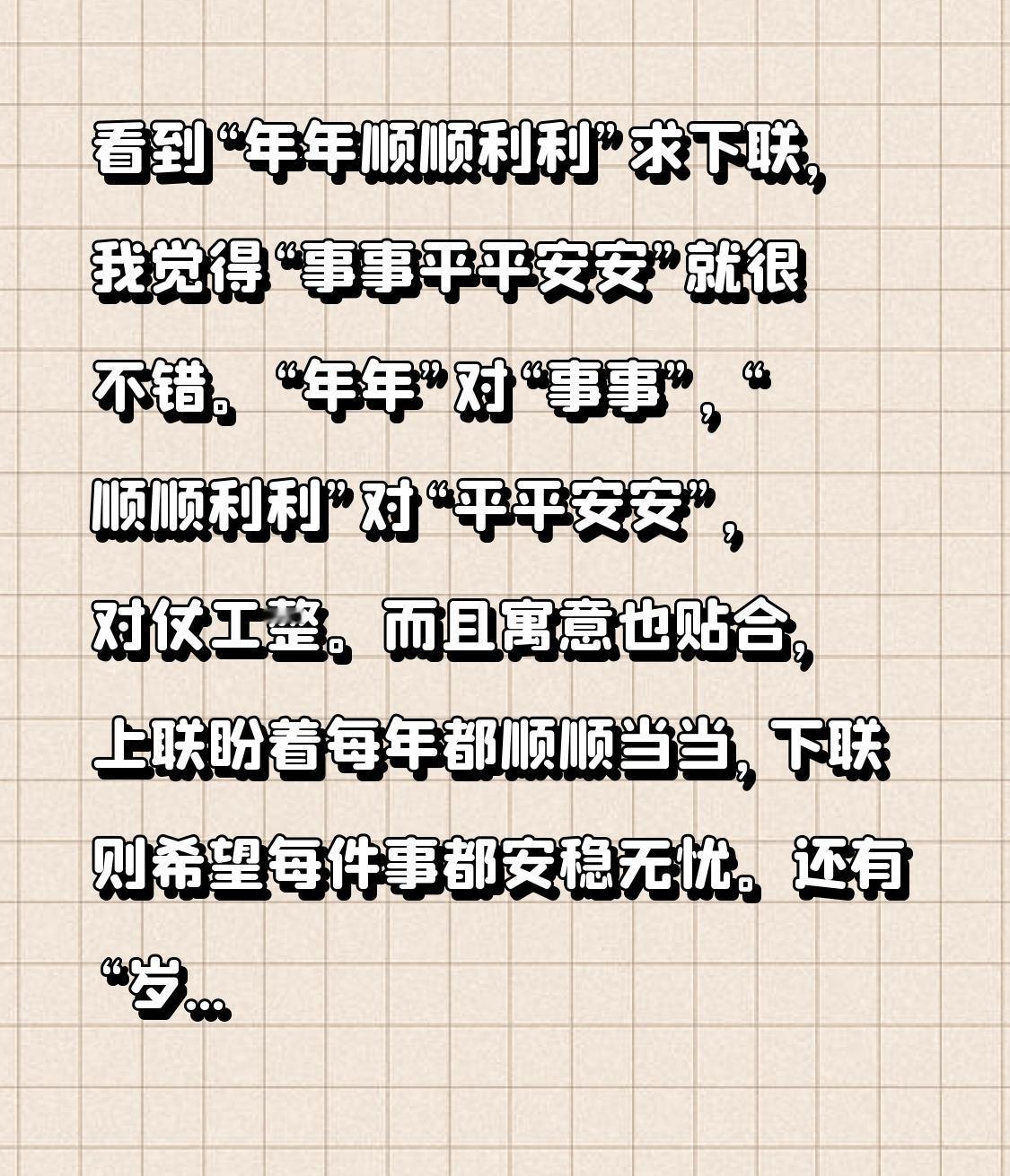 看到“年年顺顺利利”求下联,我觉得“事事平平安安”就很不错。“年年”对“事事”,“顺顺利利”对“平平安安”,对仗工整。而且寓意也贴合,上联盼着每年都顺顺当当,下联则希望每件事都安稳无忧。 还有“岁岁平平安安”也很妙,“岁岁”和“年年”意思相近却又有变化,平仄相对,读起来朗朗上口,寓意着每一年都岁月静好、安康常伴。这对联简洁有韵味,满是对生活的美好祝愿。
