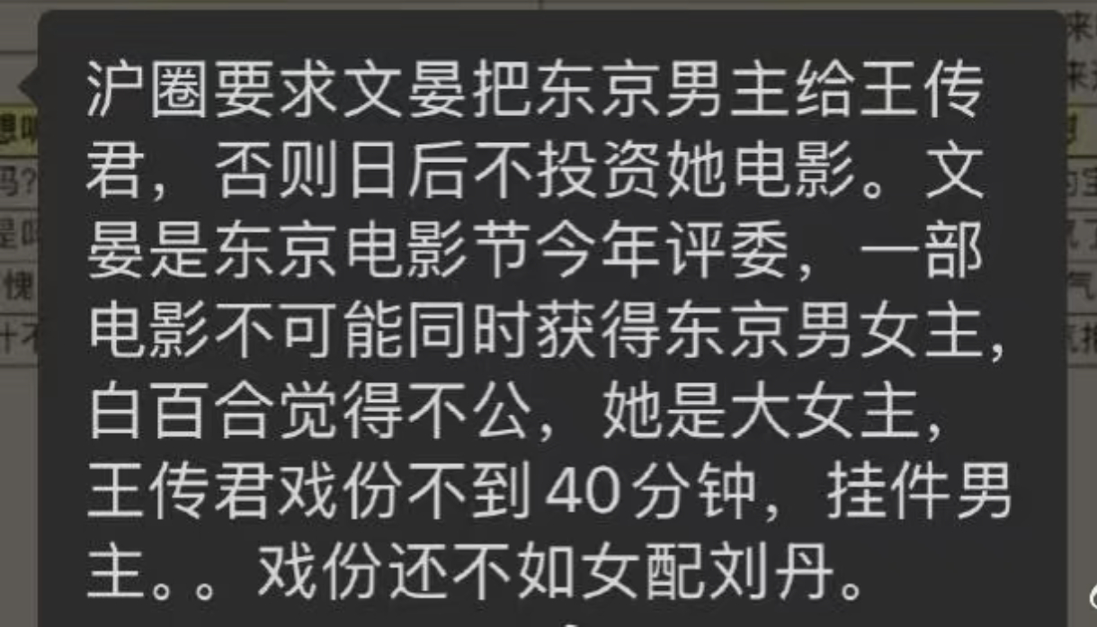 白百何发生了什么有网友爆料了:疑似是王传君《春树》获得了东京电影节最佳男主,但是白百何是这部电影的大女主,王传君戏份还不到40分钟。这条是在内涵王传君吧