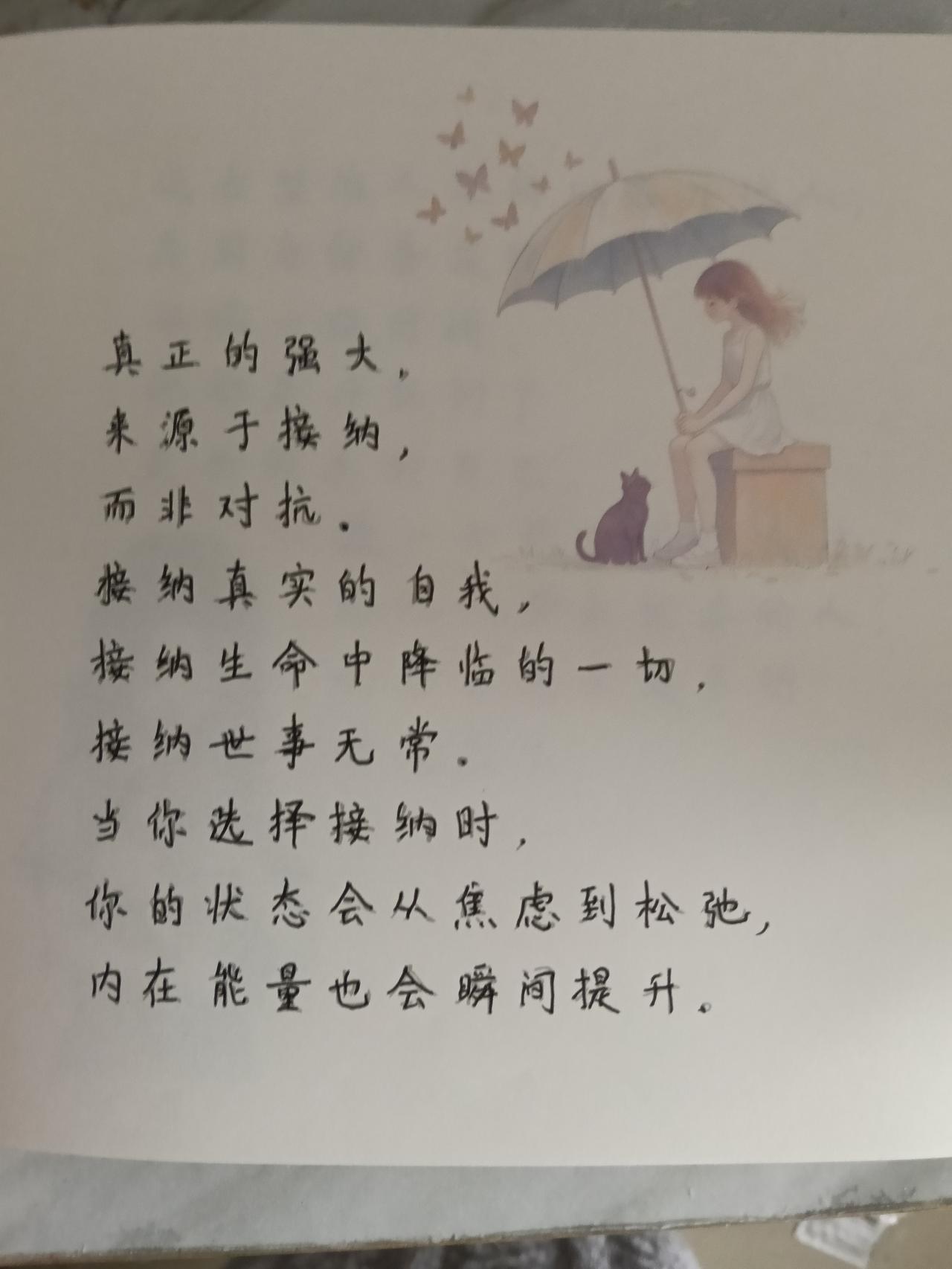 从对抗到和解:我靠“接纳”摆脱焦虑,收获了真正的强大 你是否也曾这样:面对不如意,第一反应就是“对抗”? 对抗自己的不足,对抗外界的变故,对抗一切偏离预期的轨道。结果往往是,精力耗尽,却依旧困在焦虑和内耗的漩涡里。 直到我看到了这样一幅画面(或:直到我明白了这个道理):真正的强大,原来源于接纳,而非对抗。 就像女孩撑伞,与猫对视,蝴蝶相伴——没有紧绷的对抗,只有全然的接纳与共处。那一刻,松弛感自然弥漫。 这是一种生活的智慧。当你选择敞开怀抱,与自我和世界温柔和解,内在的能量才会蓬勃生长。 ✅ 接纳真实的自我 停止对“不完美”的苛责,去发现你独特灵魂的光芒。当你成为自己,便拥有了最坚实的地基。 ✅ 接纳生命的全部馈赠 无论是惊喜的繁花,还是意外的荆棘,都是生命旅程的一部分。它们共同刻画了你成长的深度。 ✅ 接纳世事的无常 变化是唯一的不变。当我们理解并接纳这一点,便不会因一时的失控而陷入慌乱,反而能随风起舞。 从对抗到接纳,不是一个软弱的过程,恰恰是内心强大的开始。 当你真正开始实践,你会发现:紧绷的焦虑逐渐退去,从容的松弛感慢慢升起,那份源自内心的力量,会带你走向更开阔的风景