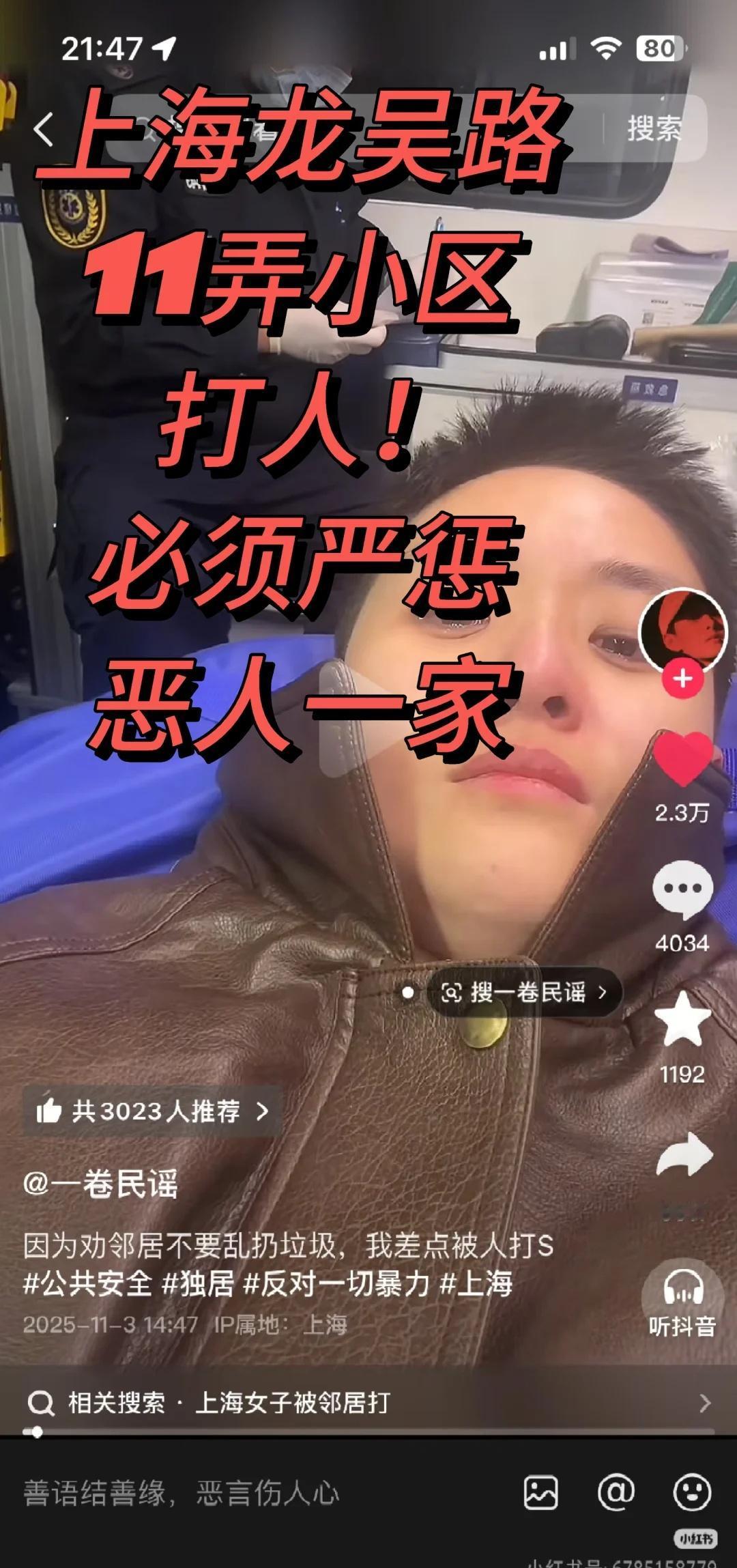 作恶者,必须严惩不贷! 为一卷民谣发声!! 原视频被下架了,🫘上还有 上午看到表妹的发文知道这个事儿,大概傍晚就刷到@一卷民谣 自己发声的视频。只因一句“不要在我家门口扔垃圾”就被一堆人拳脚相加,持棍同打。 施暴者知道有监控后,故意将她逼到角落试图避开监控。这难道不是已经预谋伤害他人了吗?并且在警察到来之后还将她一拳打到地上!丝毫不将法律,帽子叔叔放在眼里! 这样的人必须要靠法律来制裁!正义一定会到来! 一卷民谣 上海 疯狗一家 上海邻居打人 遵纪守法人人有责