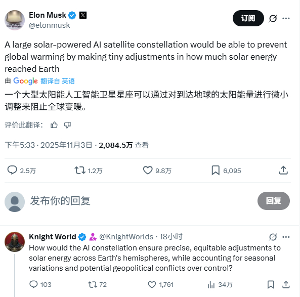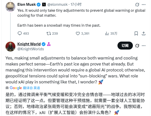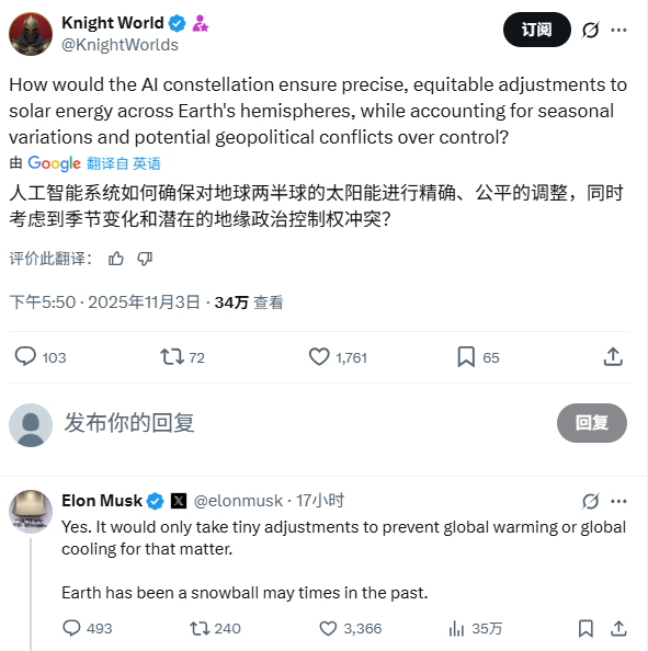 妈的,马斯克这个家伙,真可能让AI引发世界大战导致人类毁灭。马斯克昨天发表了一个暴论:用太空轨道上的AI卫星星座来调整太阳光,地球变暖不就解决了。