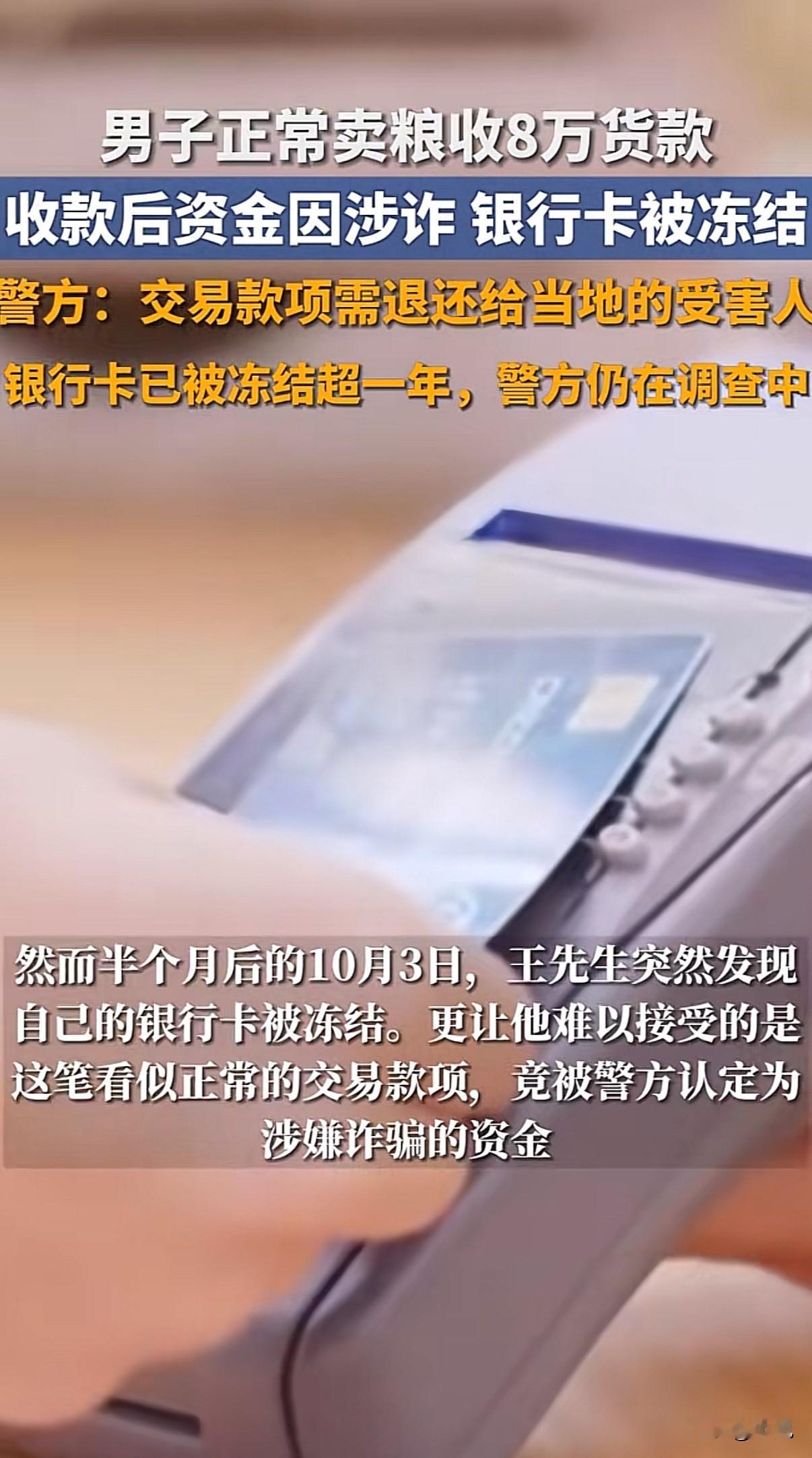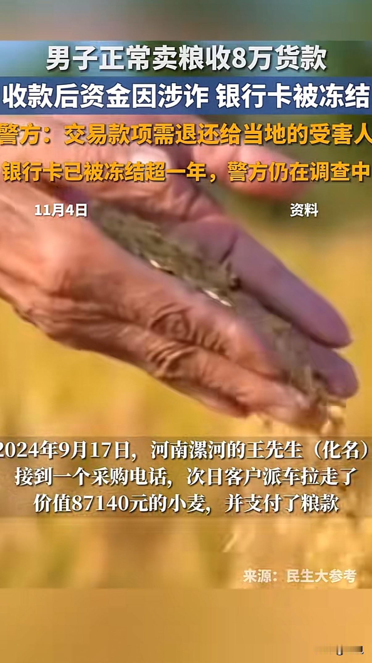 河南漯河的王先生,去年9月卖了87140元的小麦。钱到账了,粮食被拉走了。谁能想到,半个月后,银行卡突然被冻结。 更让他想不通的是,天津警方告诉他,这笔卖粮款是诈骗来的钱,要求他把钱退给受害人,才能解冻银行卡。 王先生对记者说:“我卖粮食收的货款,怎么就成了涉案资金?” 同样在河南,新乡的孙先生也遇到了几乎一模一样的事。他卖了100多吨小麦,收到28万元,两天后账户就被冻结。但经过媒体报道,他的账户在48小时内就解冻了。 两个相似的案子,结果却天差地别。孙先生的案子很快解决,王先生的卡却被冻了一年多。 法律上有个概念叫“善意取得”。意思是,如果你不知道钱是赃款,正常做了买卖,价格也合理,那你的权益应该受到保护。 专家解释,孙先生的情况符合这个条件。可到了王先生这里,同样的道理就行不通了。 这里面有个让人担忧的问题:我们普通商家,是不是在不知不觉中成了骗子的“洗钱工具”? 骗子先骗取他人钱财,然后用这些钱来购买实物商品。等他们把粮食、手机这些实物转手一卖,赃款就洗白了。最后骗子抓不着,卖货的人却要承担责任。 王先生的银行卡被冻结超过一年,这时间确实太长了。按照规定,警方冻结账户一般不超过六个月,特殊情况可以延长,但也要按规定来。 现在王先生一家生活陷入困境,生意也受影响。他说:“我也是受害人啊!” 对于咱们普通人来说,网上交易真得格外小心。特别是大额交易,如果对方坚持用银行转账,又不走平台担保,就得提高警惕。 希望王先生的案子能早日解决,毕竟一家老小还要生活,生意还要继续。更重要的是,执法环节需要更加规范,让老实做生意的人不再提心吊胆。 这件事不仅关系王先生一个人,更关系到我们每个普通人的交易安全。今天是他,明天可能就是我们中的任何一个人。