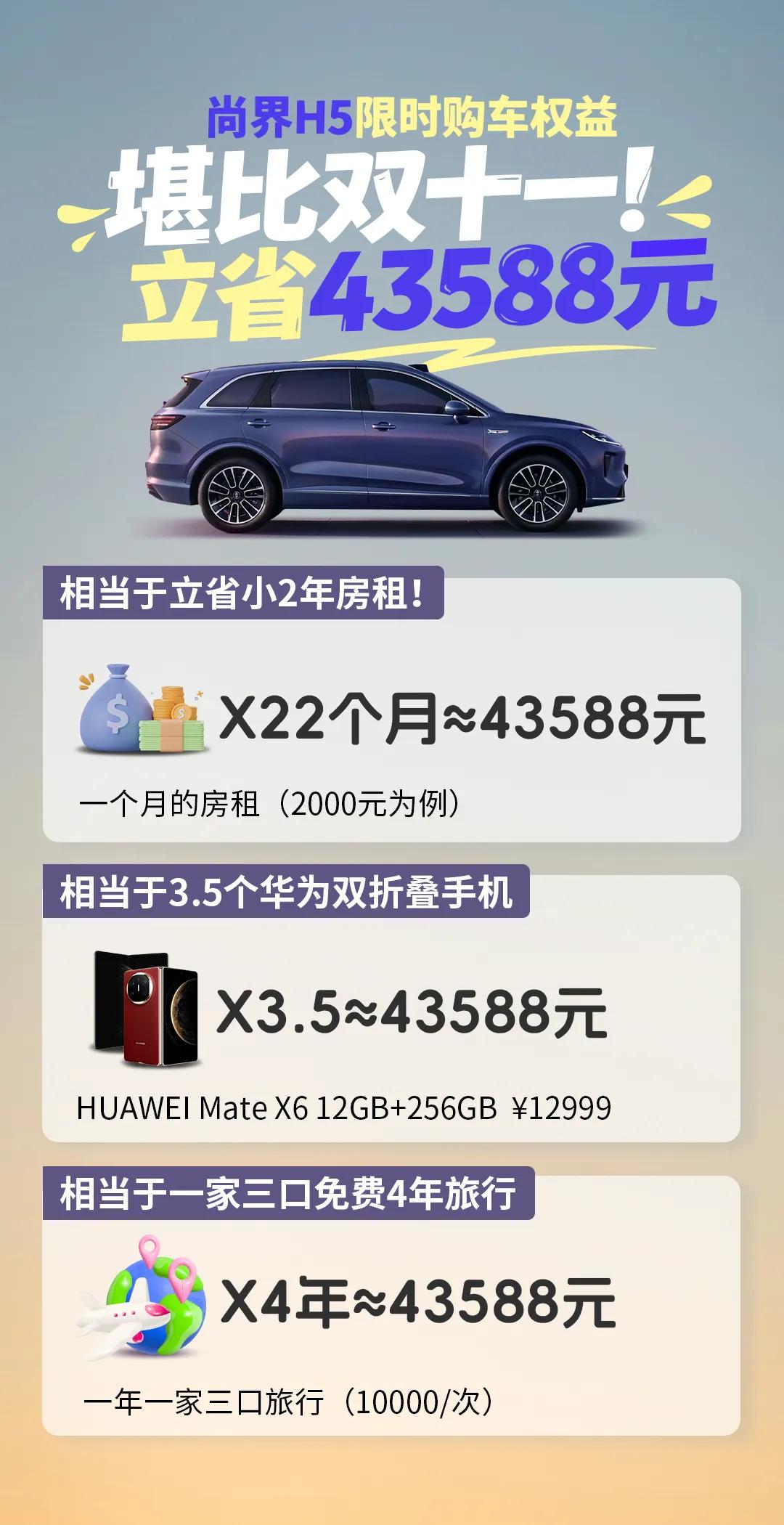 11月4日,尚界官宣了一项重磅好消息,那就是尚界H5上市仅43天,交付量就突破10000台,日均超230台,并且还是鸿蒙智行五界中交付最快的新品牌。 能够这么快交付量突破1万台,这不仅体现了消费者认可,同时也展现了尚界H5交付效率领先同级,能够拿下这一成绩并非偶然,而是其硬核产品力精准匹配家用刚需的直观体现。在品质上,尚界H5背靠华为上汽,集华为领先科技与上汽70年造车底蕴于一身,而且还有华为严格质量品控体系全面赋能,每一辆尚界H5都是华为严选,品质可靠,值得信赖。 同时产品力上,首先就是尚界H5空间表现出色,后排腿部、头部空间均超1米,椅背两档可调,能轻松容纳三名成年人。同时鸿蒙座舱支持手机车机无缝流转,语音助手可识别方言,娱乐功能丰富。标配的华为乾崑智驾ADS 4,搭载192线激光雷达等,支持车位到车位领航辅助和泊车代驾。若您在2025年12月1日前完成大定锁单,还能享至高9000元的购置税全额补贴,强大的产品力,再加上这样的福利政策,促就了尚界H5的成功。