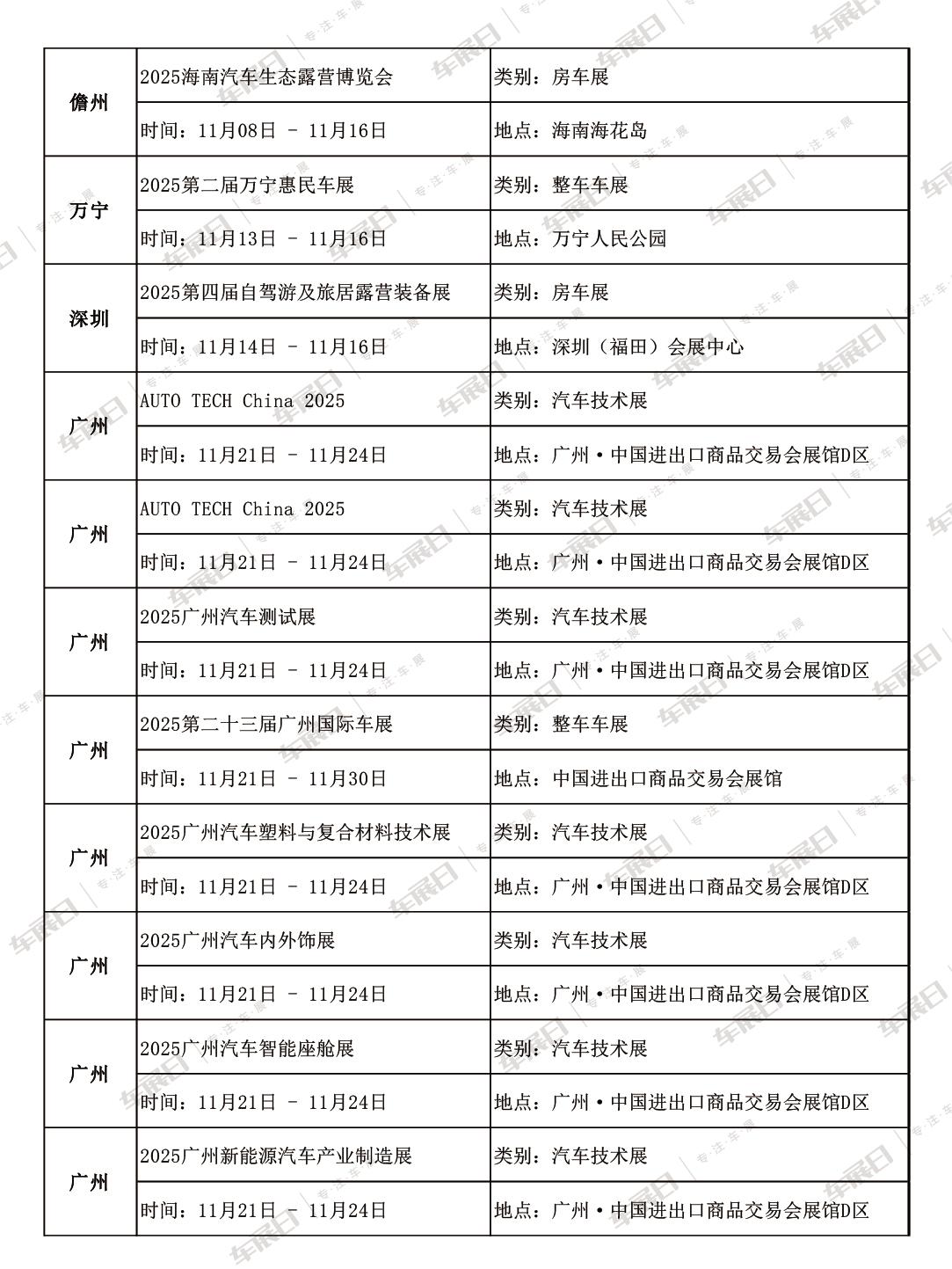 2025年11月全国车展时间安排表。我们收集整理了2025年11月全国各地车展排期信息,包括