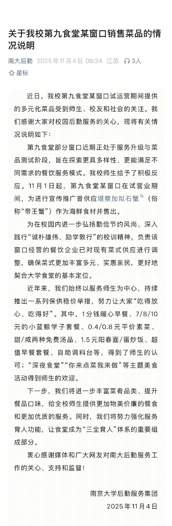 还是要给予学生以适当的选择权,学生也有在能力范围品尝美食的合法权益,不能因为提倡节俭就不让卖高档食材。如果真是因为提倡节约,是不是整个社会都不能卖高档物品?对极个别有经济能力的学生,特别是对兼职赚钱能养活自己的学生,偶尔凑钱AA一下高档食材也没问题。整个大学一天才卖一两份帝王蟹,为什么就是不节俭呢?舆论之前给了南京大学太多压力,尤其是个别官媒定性批评,有点盲目上纲上线的意思。