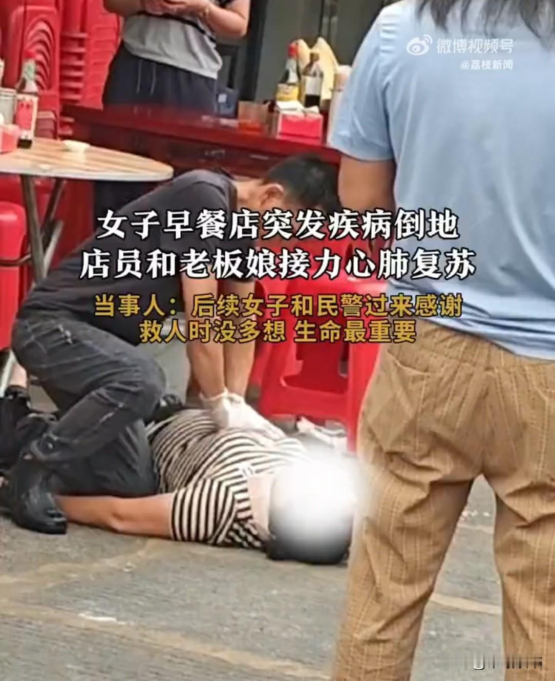广东汕尾一早餐店,一女子吃早餐突然抽搐倒地,口吐白沫。店员和老板立刻上前轮流急救,可都快半小时了,救护车还没到。 11月1日清晨,广东汕尾街头一早餐店,一女子走了进来,“老板,来一份瘦肉汤粉,少辣。” “好嘞,稍等!”灶台前的老板娘忙应下,转身就往锅里下粉。 不一会儿,店员老姚就把刚煮好的汤粉端到女子桌前,瓷碗搁在桌上时轻轻磕出“嗒”的一声,语气憨厚:“小心烫,慢用啊!” 说完转身要去收拾邻桌的空碗,脚步还没迈出去,身后就传来一声尖锐的“啊!” 老姚猛地回头,心脏瞬间揪紧,只见刚才点汤粉的女子直挺挺倒在地上,身体不停抽搐,嘴角还往外冒白沫,右手紧攥着的汤勺掉在脚边。 “姑娘!你怎么了!”老姚连忙蹲下身查看,他试探了下女子的鼻息,又摸了摸颈动脉,“还有气!得做心肺复苏!” 他立刻跪坐在女子身侧,双手交叠按在对方胸口,跟着之前学过的急救节奏往下按压。 后厨的老板娘听见外头的动静,手里的围裙都没来得及解,快步跑了出来,看见地上的女子和满头大汗的老姚,“这是怎么回事?” “不清楚不清楚!” “这姑娘刚端上粉,拿着勺子正要往碗里伸,还没碰到汤呢,人就直挺挺倒下来了!”与女子同桌吃饭的路人忙接过话,语气还带着一丝慌乱。 老板娘听后,心里不免有些庆幸,还好这姑娘没吃,这要是动了一口再发病,就算说破嘴,怕是也难撇清关系。 可转念一想,地上的姑娘还在抽搐,她又立刻把心思收回来,眼睛死死盯着老姚的动作。 见老姚按压的速度越来越慢,肩膀都开始微微发抖,明显是力气快耗光了,忙喊:“老姚,换我来!你歇口气!” 说着就跪下去接替老姚,双手按在女子胸口时,能清晰感觉到对方身体的僵硬,她咬着牙,一下一下按得格外用力,嘴里还不停喊:“姑娘,撑住啊!救护车马上就到了!” 老姚在旁边喘着气,一边用袖子擦汗,一边盯着墙上的挂钟,分针转了一圈又一圈,眼看都快半小时了,门外还是没动静。 他急得直跺脚,又怕动静太大影响急救,只能攥着拳头,指节都泛了白。 “这救护车怎么还没到啊?再晚点儿可就来不及了!” 围观的路人里有人忍不住喊了一声,语气里满是焦急,还有人掏出手机又打了一遍120,对着电话那头不停催促:“就在老城区XX路口的早餐店,人都抽搐半小时了,你们快点!” 老板娘的胳膊早就酸得发麻,老姚在旁边看着,实在忍不住想再换回来,可刚要开口,就听见门外传来了刺耳的救护车鸣笛声,由远及近,越来越清晰。“来了来了!救护车来了!” 大家看着医护人员抬着担架跑进来,把女子小心地抬上去,悬着的心才彻底落了地。 好在,女子经过医院救治后,并无大碍。 事后,女子还带着民警专门到早餐店致谢了一番。 老板店员接力救人,暖了人心。救护车虽晚到,万幸人没事。老话讲“救人一命,胜造七级浮屠”,这份善良,值得点赞!