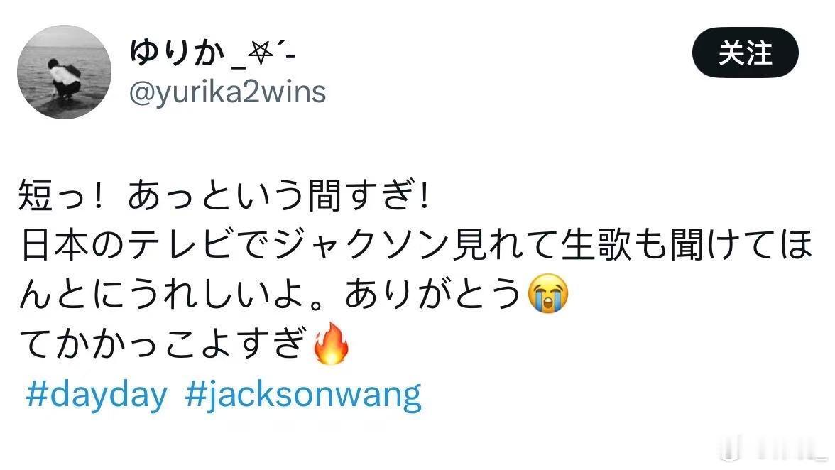 打开日本电视台看到王嘉尔 看到在日本DayDay节目上,演唱《Made Me a Man》时的舞台魅力真是太强了!他完全掌控全场,帅气与才华兼备,这次出演国际顶级节目,必定让东京演唱会更加值得期待!