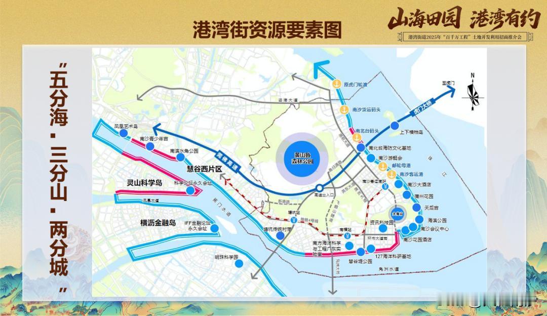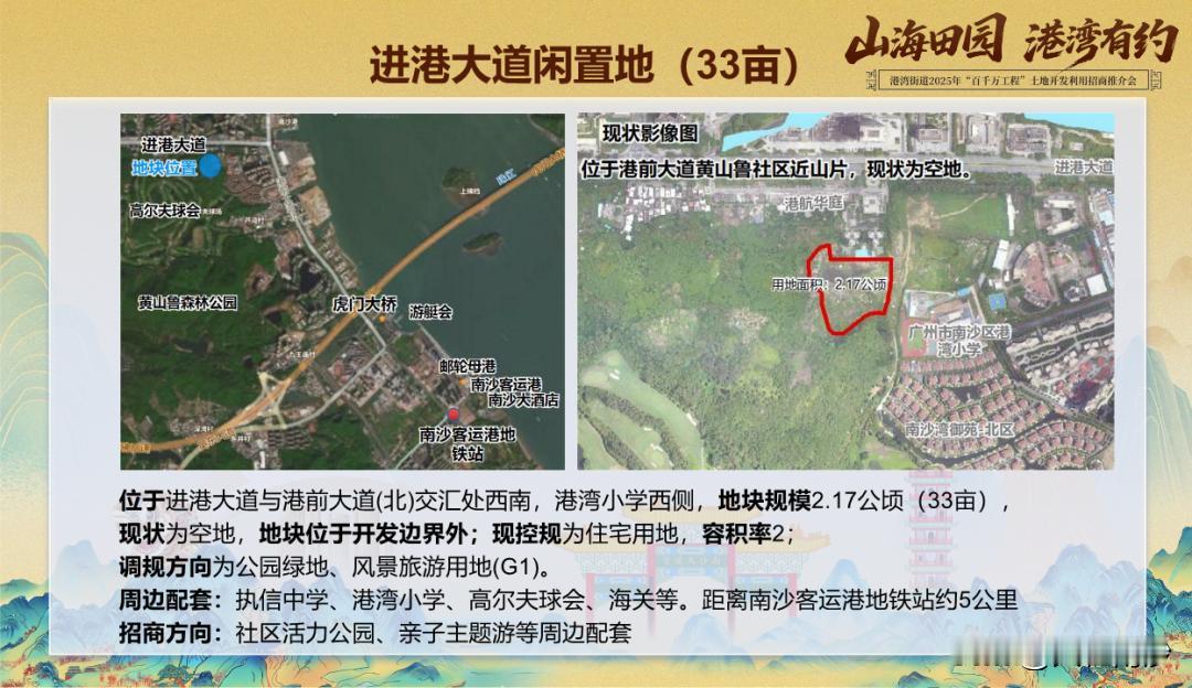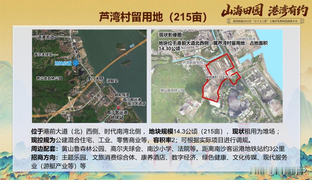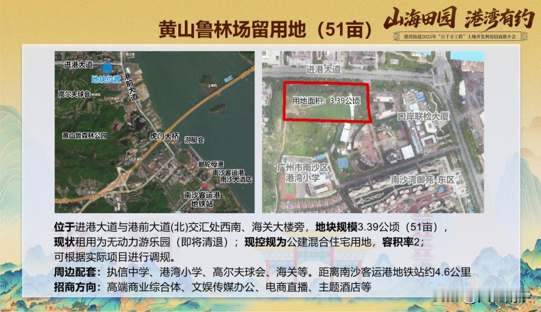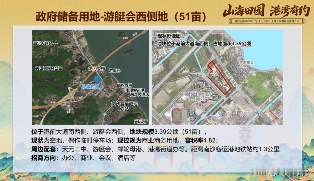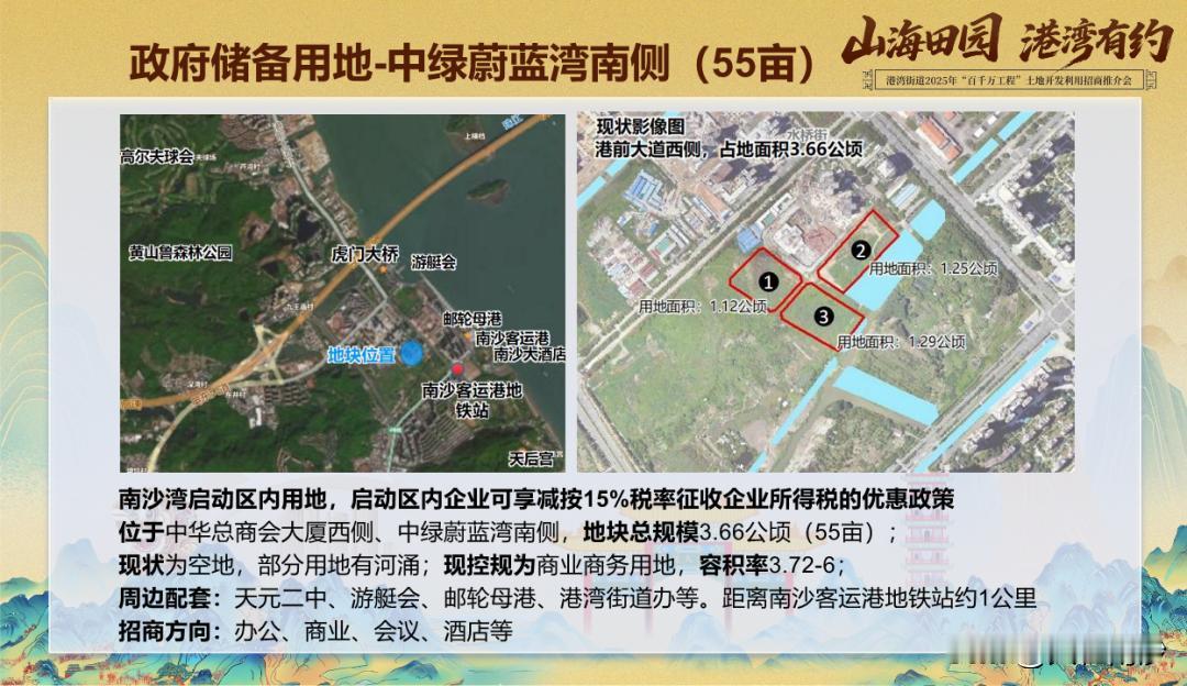 【南沙湾终于要推地了?】 10月31日,“山海田园,港湾有约”——港湾街道2025年“百千万工程”土地开发利用招商推介会在南沙中交邮轮母港举办。本次活动由港湾街道办事处主办,活动吸引了东方文旅集团、裕岭房地产、上海集链产合集团、中建二局投资公司等近80家企业参与。 本次推介会重点推出了村属土地资源12宗,约523亩;村闲置厂房用地2处,约35亩;以及可经营性政府储备用地及国有土地约2972亩。 数一数时间距离上一次南沙湾拍地,已经是2021年的事了,当时出让的是2021NJY-13地块地块,由珠江实业+南投联合体拿下,开发了住宅项目公园海和花园酒店二期项目。 这次推介会中,比较受关注的地块有如下: 黄山鲁林场留用地:也就是港湾之星乐园地块,官方描述中写明可引入山姆。 芦湾村留用地:在芦湾村和时代南湾中间那块,意味着芦湾村旧改短时间内还是没戏。 九王庙村留用地:之前规划为黄山鲁东门的地块,现在又说要搞成住宅和商业。 另外还有多块被列为南沙开发建设有限公司的地块,很明显这些地块应该就是大家熟知的H家地块了,地块包括了南沙客运港广场,南沙大酒店,南沙客运港地铁站B口出来的大型停车场地块,星河山湾海北侧的大面积地块,蒲州花园地块,南沙资讯科技园以南的大把地块,甚至还有南沙高尔夫球场还有商业地块。 由于这些地块已经名花有主,因此列出了这些地块大概率应该是希望看看有没有想要一起共同合作开发的项目。 大家觉得南沙湾现在会有开发商认同吗?