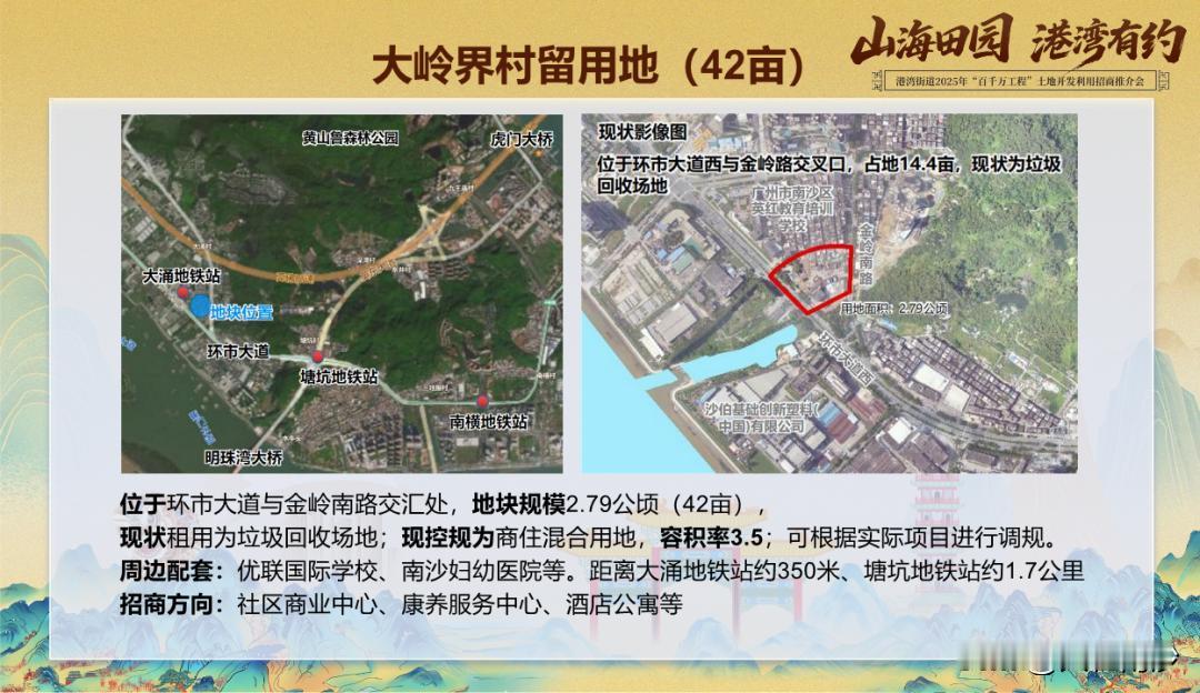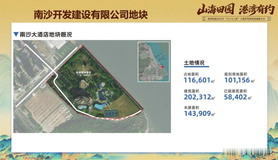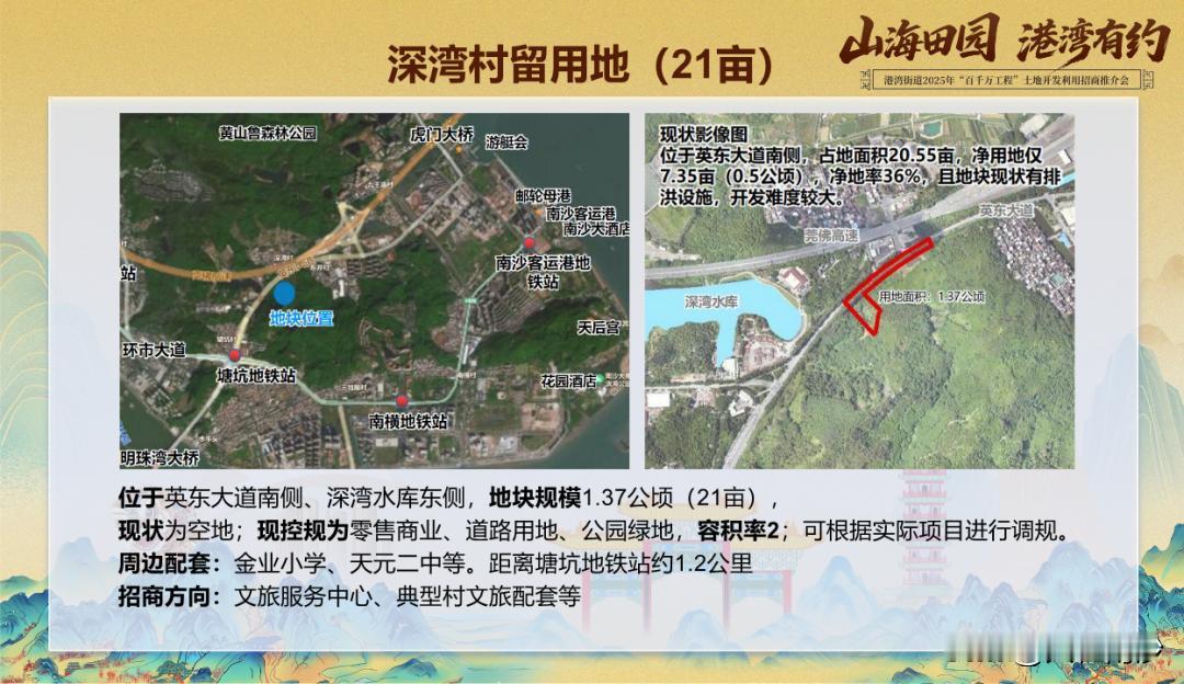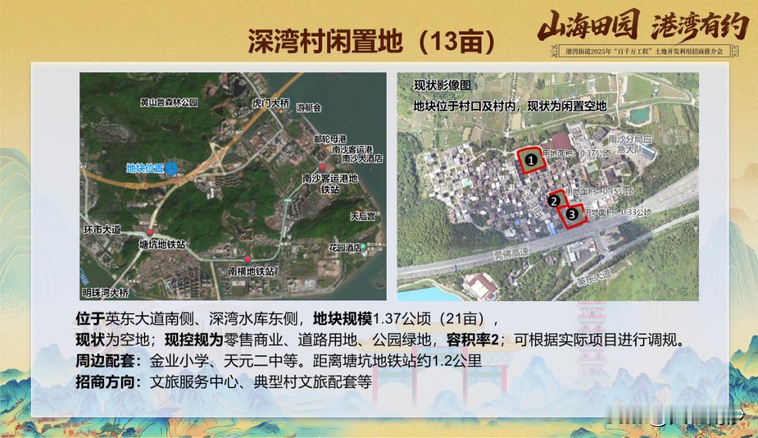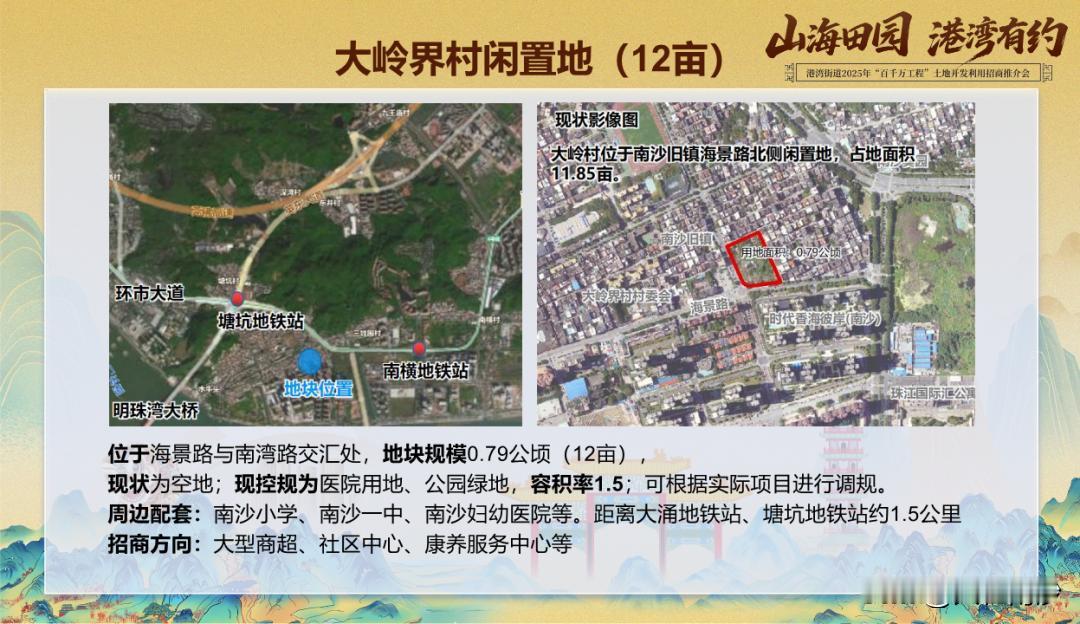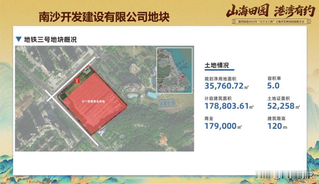 【南沙湾终于要推地了?】 10月31日,“山海田园,港湾有约”——港湾街道2025年“百千万工程”土地开发利用招商推介会在南沙中交邮轮母港举办。本次活动由港湾街道办事处主办,活动吸引了东方文旅集团、裕岭房地产、上海集链产合集团、中建二局投资公司等近80家企业参与。 本次推介会重点推出了村属土地资源12宗,约523亩;村闲置厂房用地2处,约35亩;以及可经营性政府储备用地及国有土地约2972亩。 数一数时间距离上一次南沙湾拍地,已经是2021年的事了,当时出让的是2021NJY-13地块地块,由珠江实业+南投联合体拿下,开发了住宅项目公园海和花园酒店二期项目。 这次推介会中,比较受关注的地块有如下: 黄山鲁林场留用地:也就是港湾之星乐园地块,官方描述中写明可引入山姆。 芦湾村留用地:在芦湾村和时代南湾中间那块,意味着芦湾村旧改短时间内还是没戏。 九王庙村留用地:之前规划为黄山鲁东门的地块,现在又说要搞成住宅和商业。 另外还有多块被列为南沙开发建设有限公司的地块,很明显这些地块应该就是大家熟知的H家地块了,地块包括了南沙客运港广场,南沙大酒店,南沙客运港地铁站B口出来的大型停车场地块,星河山湾海北侧的大面积地块,蒲州花园地块,南沙资讯科技园以南的大把地块,甚至还有南沙高尔夫球场还有商业地块。 由于这些地块已经名花有主,因此列出了这些地块大概率应该是希望看看有没有想要一起共同合作开发的项目。 大家觉得南沙湾现在会有开发商认同吗?