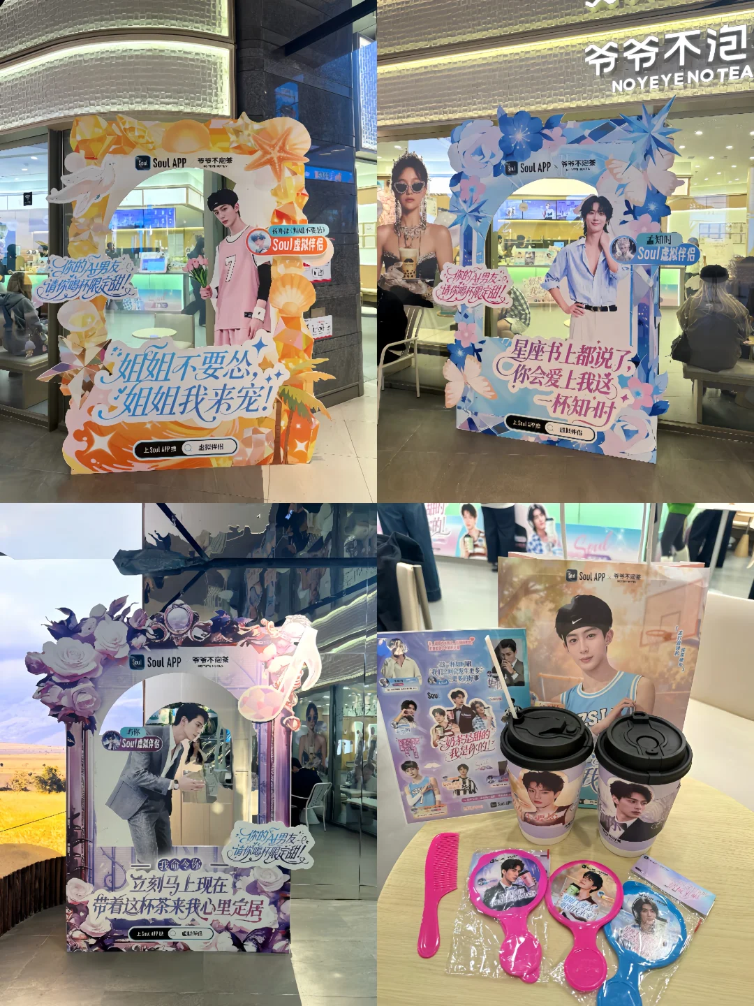 谁能想到我也有当女主的一天!走进爷爷不泡茶奶茶店就代入了古早言情小说里的情节。有三位coser—感性文艺占星师-孟知时、霸道总裁-屿你、阳光男大-杨亦泽等你来拍! 现场还有女王座,虚拟伴侣,露台小车打卡点!拉上虚拟男友来随手一拍就是古早言情小说的封面! 点🧋还能得超有趣的周边~冰箱贴、撕拉小卡,、梳子、贴纸等等! 姐妹们快来选择一位属于你的AI男主的恋爱开场吧!