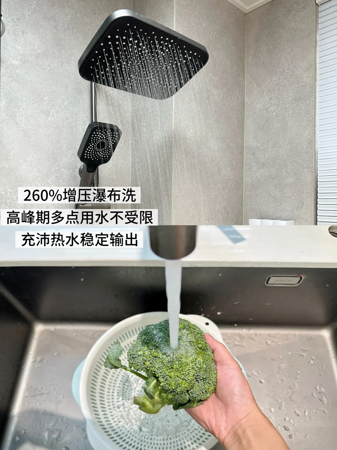 85W大功率增压+260%水量提升,像我家楼层高,用水高峰也完全不影响出水。老公下班回来洗澡,我在厨房洗菜洗碗,水量也完全不受限