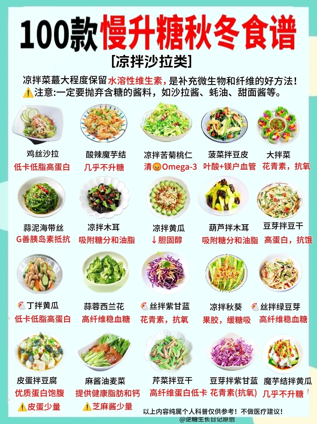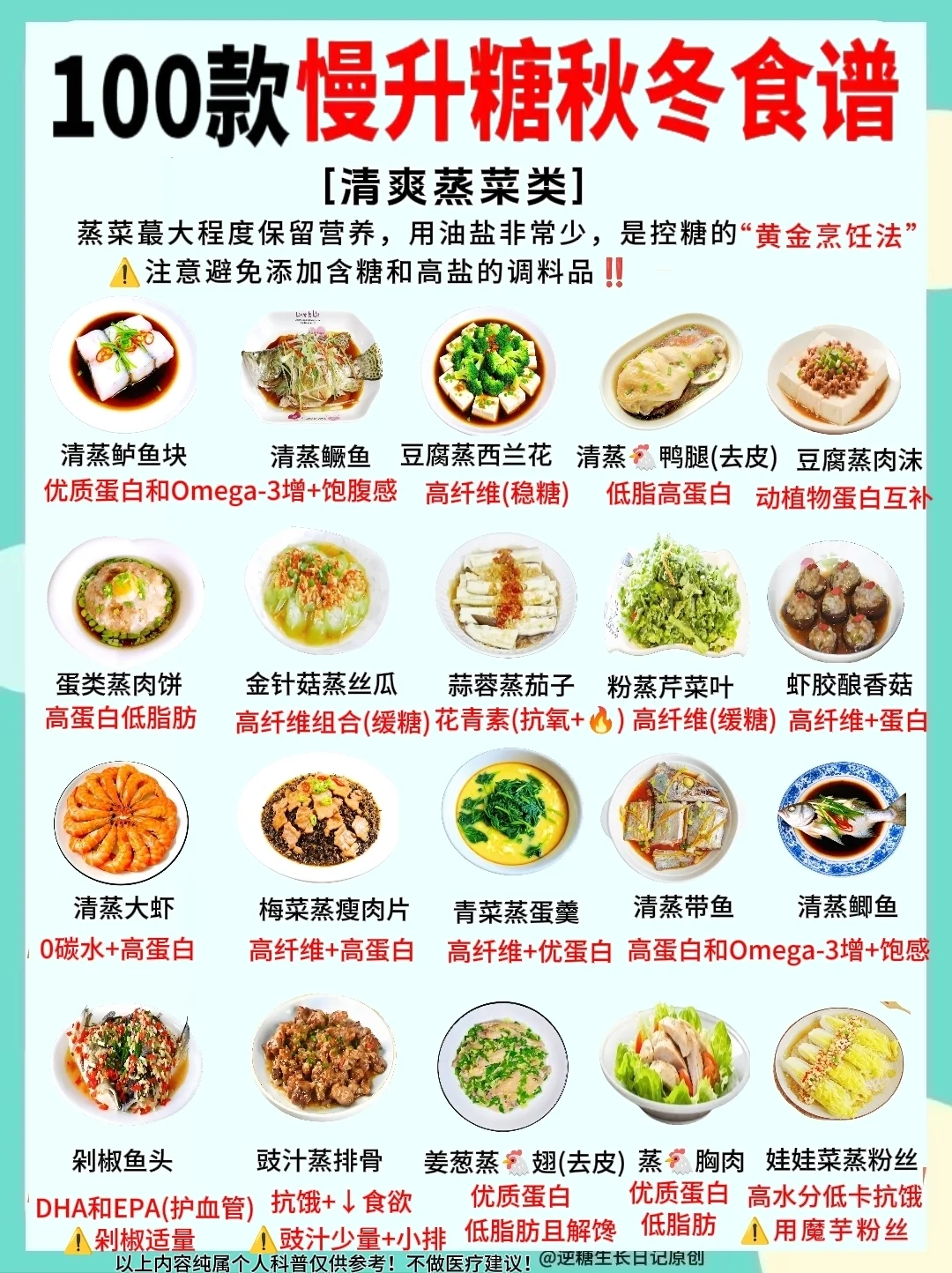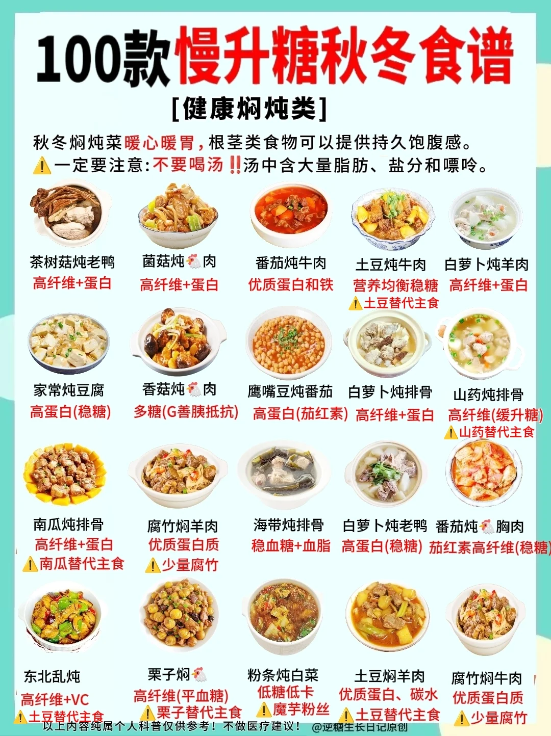 家人们!秋冬控糖太难了😭 温度一降,就想吃点热量高的食物! 💔血糖剧烈波动就焦虑! 别慌!🔥今天整理了私藏的“100款慢升糖秋冬食谱”! 💥从暖身汤羹到香喷喷的焖炖菜,好吃营养又稳糖! 💝怕冷又怕糖高的糖友们,赶紧码住! . 👇以下是控糖家常菜的详细注意事项👇 一、“会选”食材是关键 ❶.主食“粗”一点:全谷物、杂豆类、根茎类与白米面比例1:1。 如糙米、荞麦、红豆、绿豆、红薯、甜玉米等。富含纤维,消.化缓慢,升糖慢。 . ❷.蔬菜“多”而“彩”:每天≥500克,以深色蔬菜为主。 如绿叶蔬菜、瓜茄类、菌菇类、十字花科、芹菜等。 ⚠️淀粉类蔬菜(替代部分主食):土豆、莲藕、南瓜等。吃了这些,要减少主食量。 . ❸. 蛋白质“优”而“瘦”: 如鱼虾、禽肉(去皮)、瘦猪牛羊肉、🐔蛋、豆制品等。 . ❹.水果,在两餐之间作为加餐,选低GI,每次100克。 如草莓、西梅、苹果、柚子等。 ❌不吃:果汁、高GI水果(榴莲、桂圆)。 . 二、 烹饪方法是核心 ❶.烹饪顺序:先洗后切,急火快炒,可避免水溶性维生素的流失。急火快炒能减少热量吸收,保留营养和口感,减少油脂。 ❷. 烹饪方式:蒸、煮、炖、凉拌、快炒为主,避免红烧、勾芡、油煎炸、糖醋等。 ❸.调料:天然替代,清淡为主,❌添加糖、蜂蜜等。用葱姜蒜、花椒等天然食材提味。 ❹.减“盐”和“酱油”:使用限盐勺,选低钠酱油。菜出锅前再放盐。 ❺. 控油:使用控油壶,采用蒸、煮、凉拌等方式。 . 三、 进食顺序与分量是稳糖关键环节 ❶.正确进餐顺序:汤 → 菜 → 肉 → 饭 餐前喝汤:增加饱腹感(清汤)。 然后吃蔬菜:用高纤维“垫底”。 再吃蛋白质:增加饱腹感。 蕞后吃主食:已有饱腹感,减少主食摄入。 . ❷.使用小型餐盘 用小号的碗、盘盛饭和菜,从视觉上产生满足感,减少食物摄入。 好控制量,避免多余食物诱惑。 . ❸. 细嚼慢咽,定时定量 吃饭速度慢,大脑有时间接收到“饱”的信号,每口嚼20次左右。 规律进餐,避免太饥饿引起下餐大量进食。 . 四、“隐形糖”和“隐形盐” 糖:甜面酱、辣椒酱、蚝油、番茄酱、碳酸饮料、风味酸奶、即食麦片。 盐:咸榨菜、加工食品、味精、调味料。 . ——控糖家常菜黄金法则 主食粗杂一点,蔬菜多一点,蛋白优一点,口味淡一点,顺序巧一点。