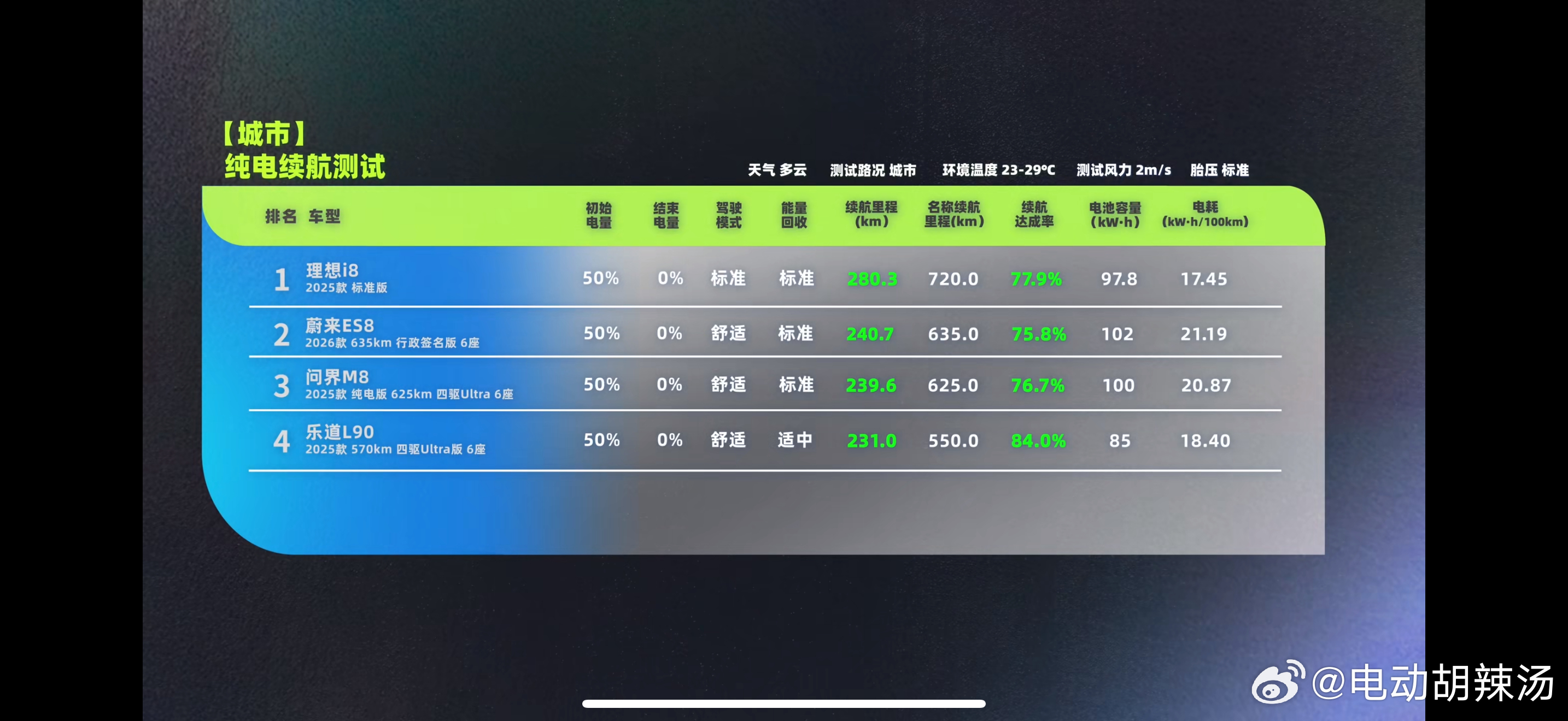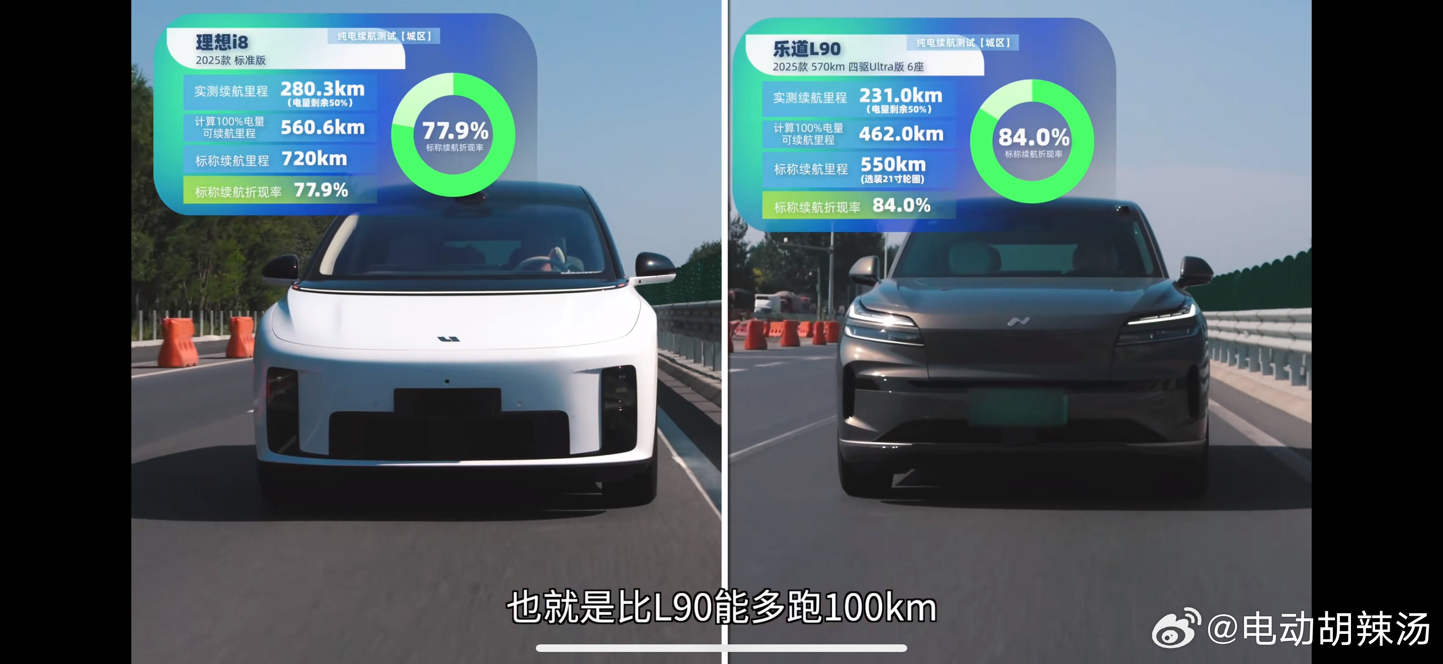 而到了后50%的城市工况,更轻的L90就有优势了,续航达成率最高,但无奈电池最小;理问蔚乐四家分别为280、240、240和231Km…