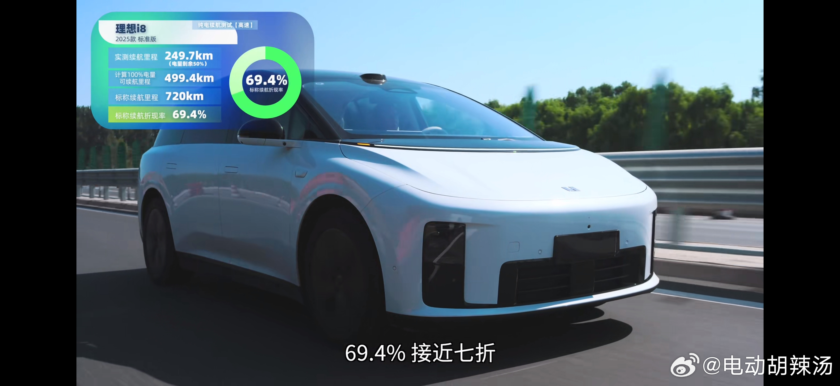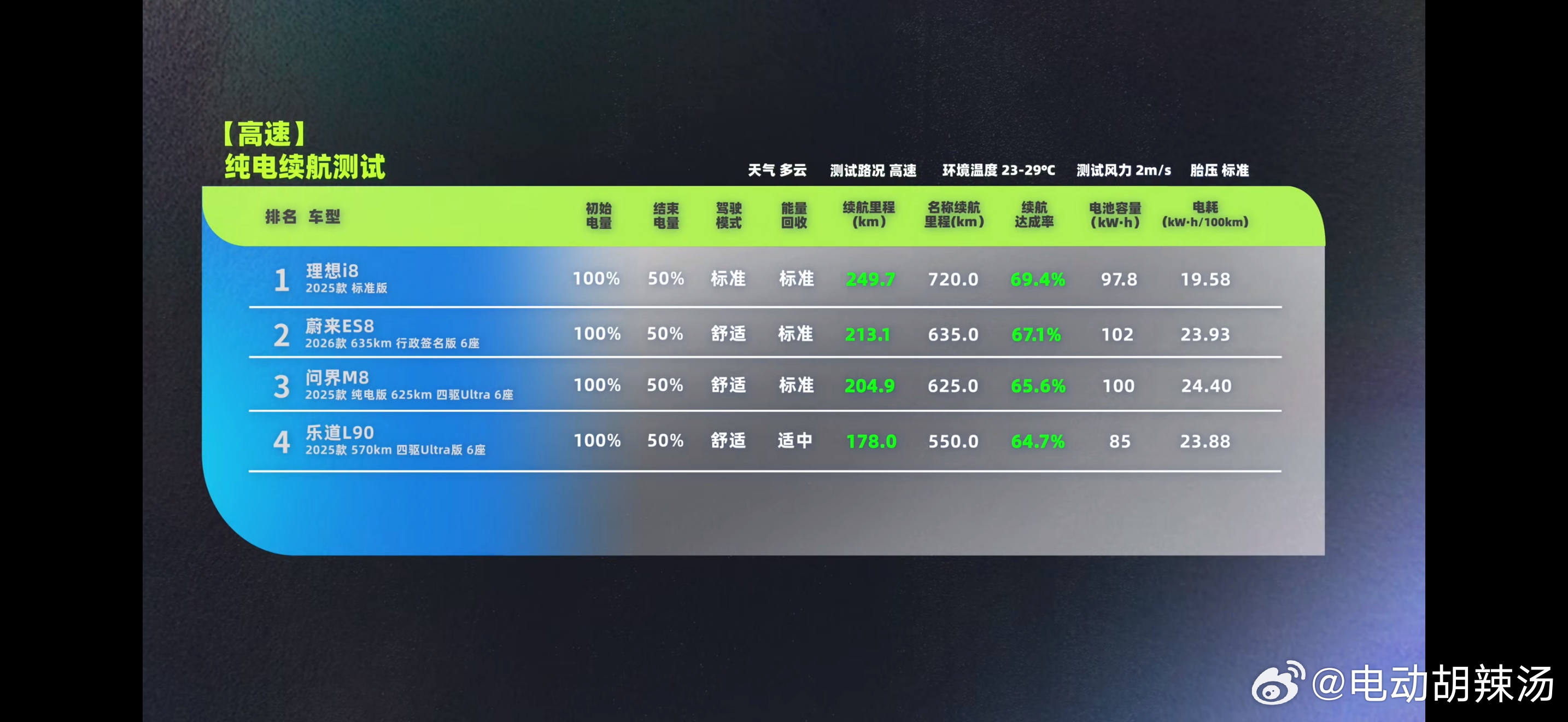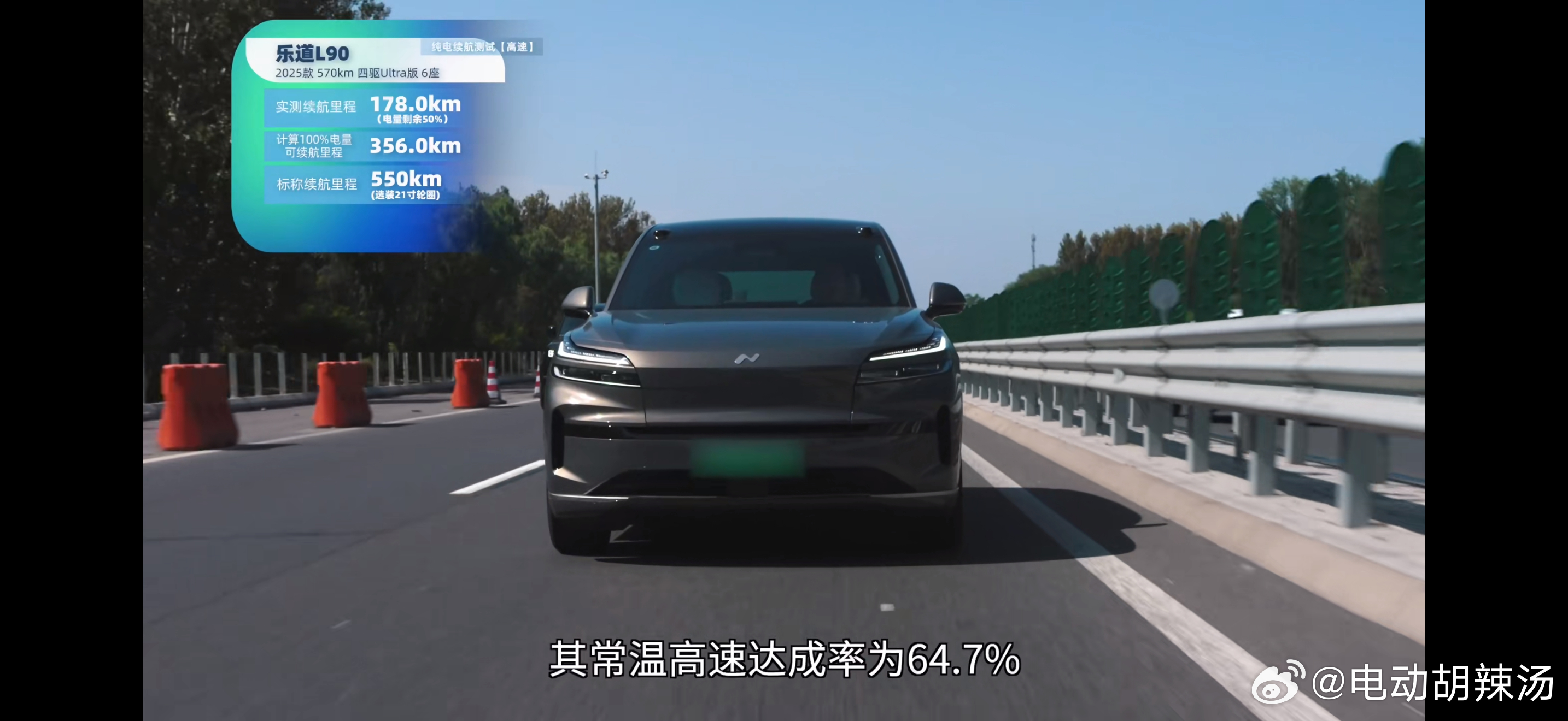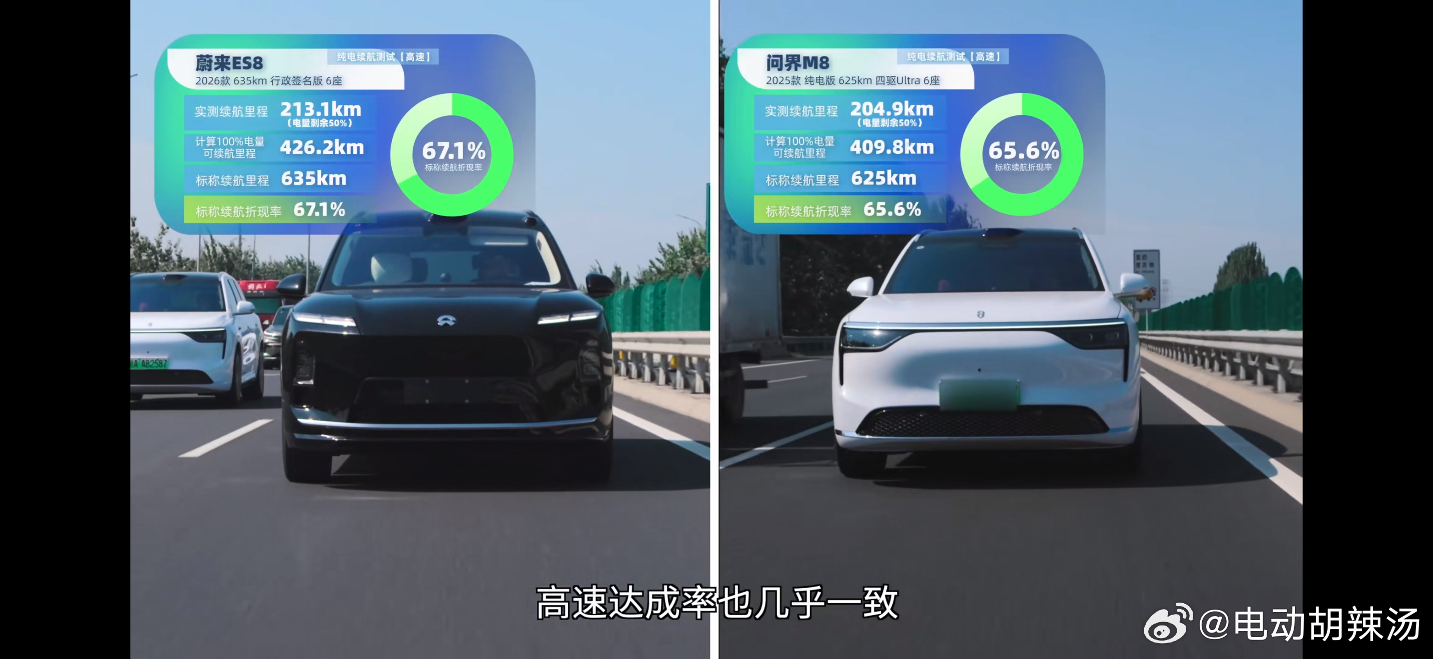 折合100电量满电高速(平均时速100左右,具体自行看看视频)续航,理想i8 可以跑500km,问界M8 和蔚来ES8 可以跑410km和426km,而乐道只能跑356公里!