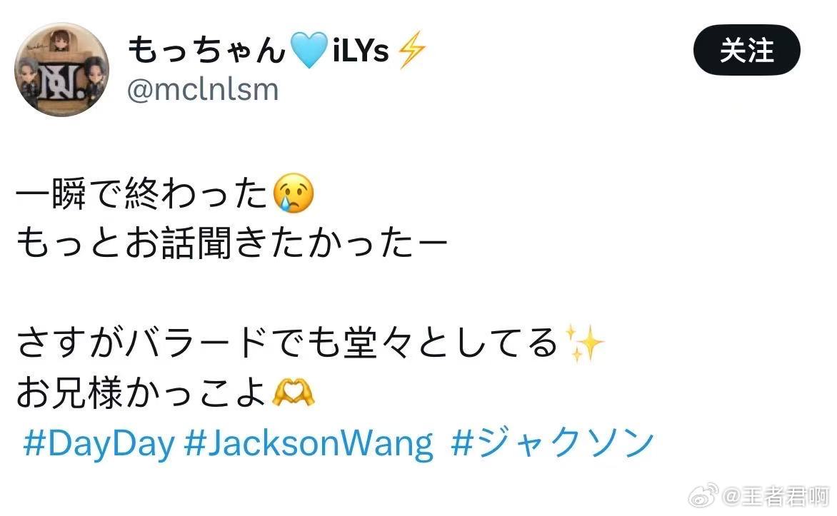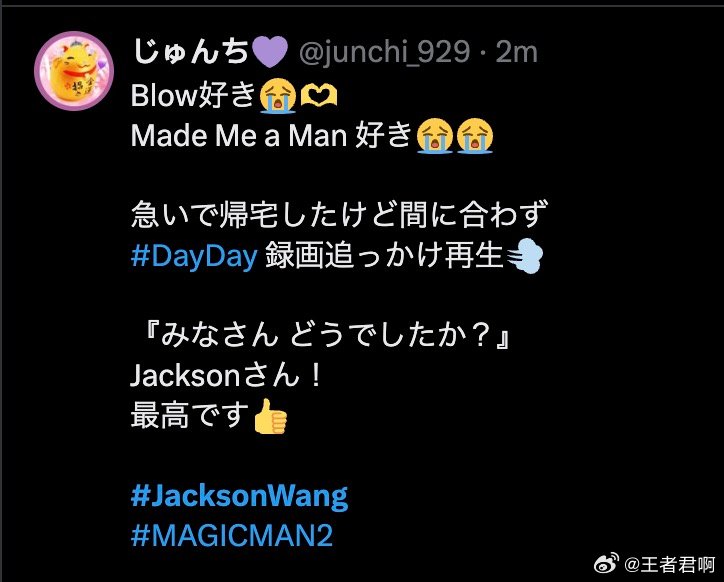 打开日本电视台看到王嘉尔 日本DayDay节目看到Me a Man》那一刻,简直完美!不怕镜头的他,舞台魅力十足,表现力超强,期待东京演唱会现场更加震撼!中国艺人的国际排面超强!