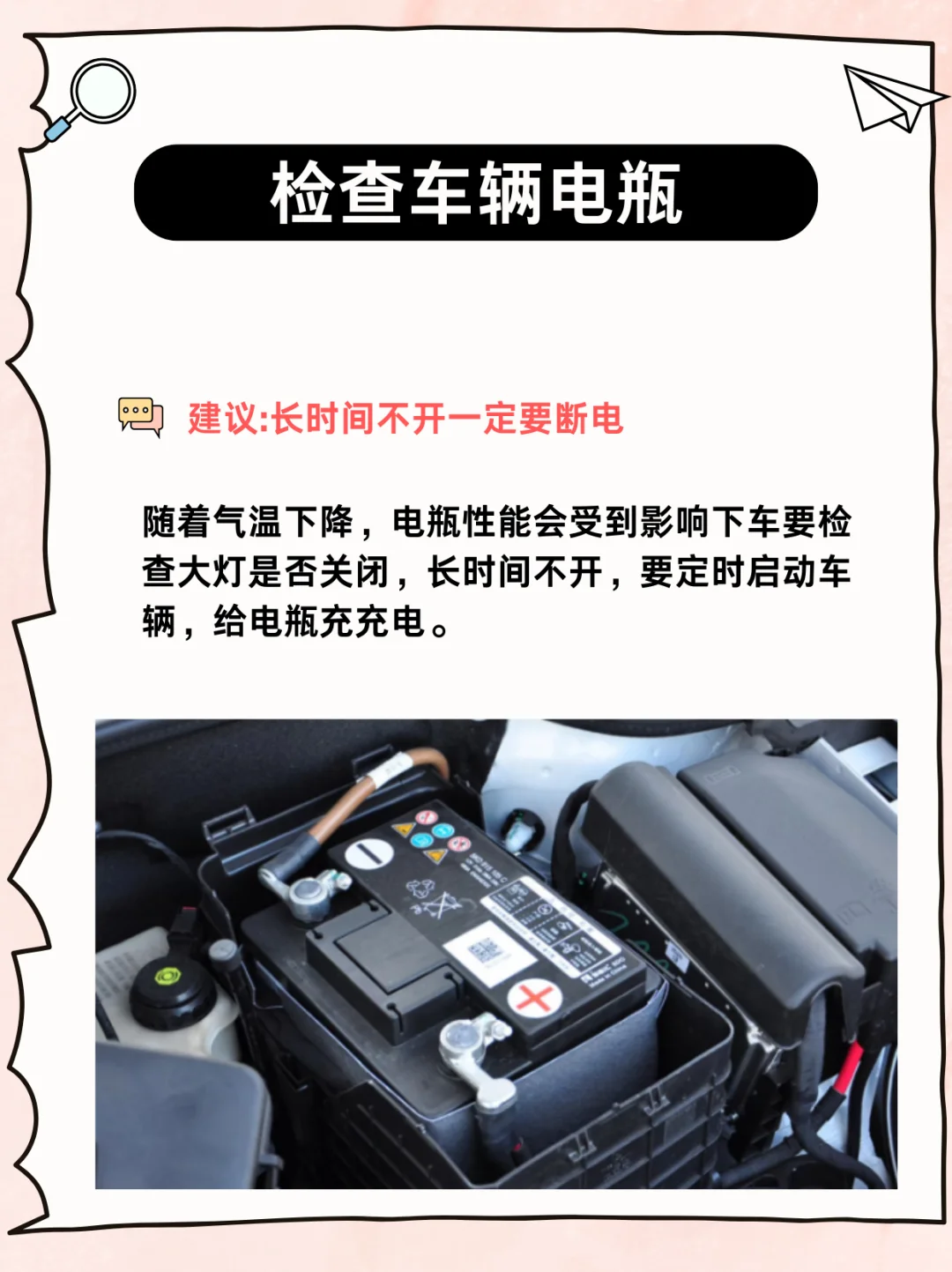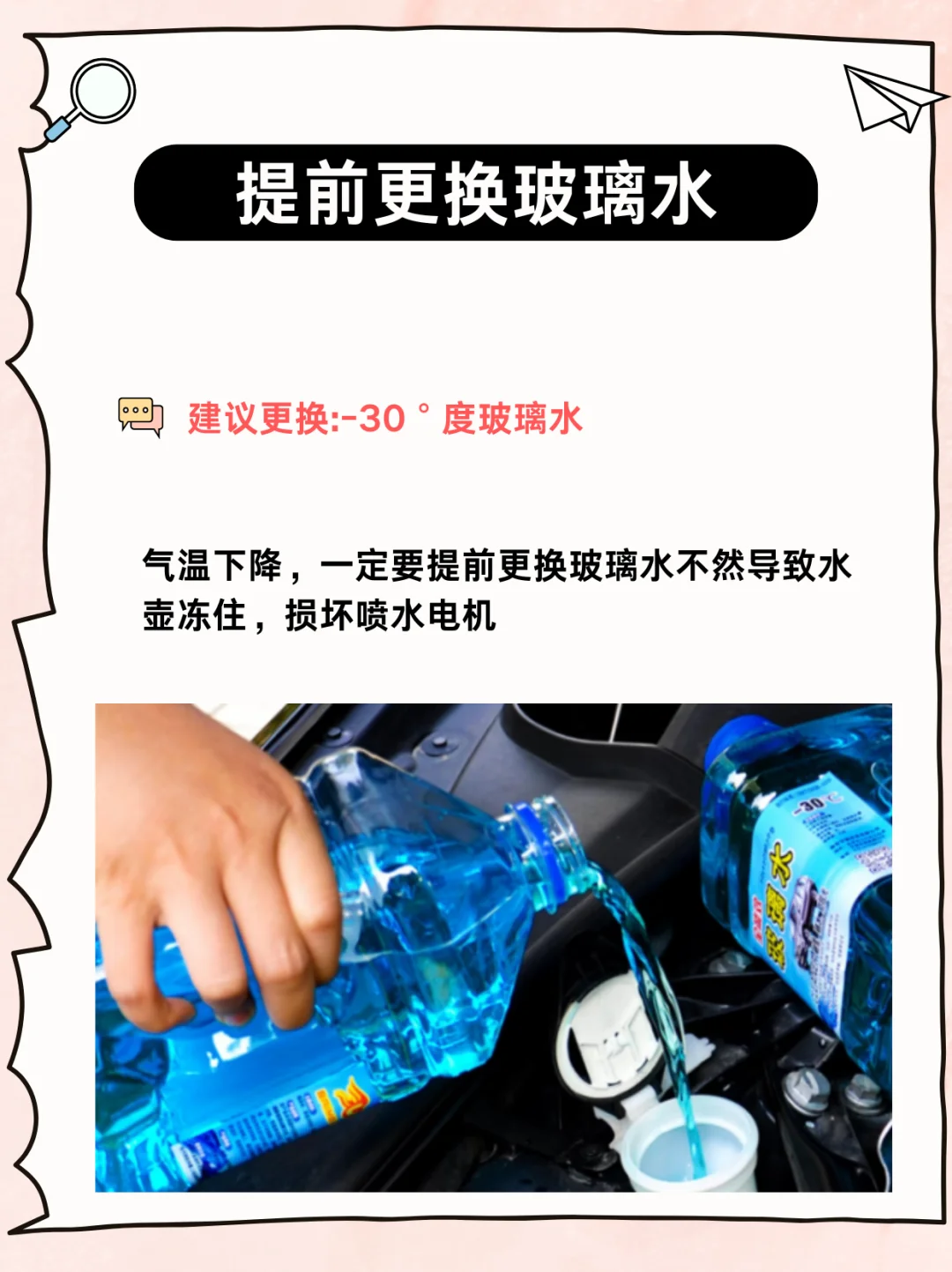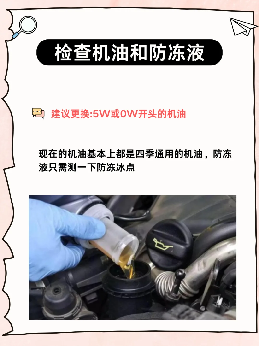 天气转凉一定要及时检查和更换这几个地方 1.检查轮胎胎压 2.检查雨刷器 3.检查机油和防冻液 4.提前更换玻璃水 5.检查车辆电瓶