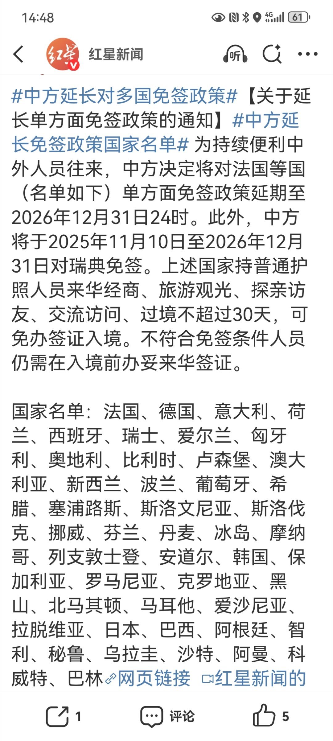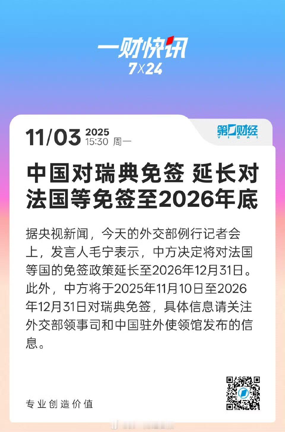 【中国对瑞典免签延长对法国等免签至2026年底】中国外交部领事司于11月3日宣布