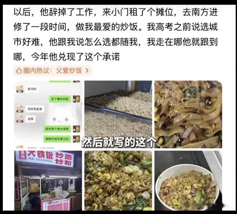 “你走到哪,我就跟到哪”——这句话听起来像极了不靠谱的承诺,可它偏偏出自一位父亲的口中。女儿考上大学后随口抱怨学校饭菜“没家味”,他竟真的辞掉工作,跨越900多公里,跑到女儿校门口支起炒饭摊。这哪是炒饭啊,分明是把家的烟火气打包带到了她眼前。 填志愿时爸爸那句“随便选,我跟着你”的玩笑话,她压根没当真。有些人的爱,从来不用“下次一定”,而是“现在就做”。 更让人鼻酸的是,这位老爸为了女儿一句话,偷偷跑去学厨艺,开业第一天只卖出7份炒饭。女儿开玩笑说自己当家教赚了70块,结果老爸说还是你厉害,比我挣得多。”这话听着让人心里一揪。 后来女儿把故事发上网,没想到同学们呼啦啦组团来打卡。现在摊子前排长队的不只是馋炒饭的人,更多是来“蹭”这份笨拙又滚烫的父爱。有网友说得特戳心:“他可能不会说‘我爱你’,但他会带着锅铲来找你。 太多父母把“舍不得”变成“不许走”,这位爸爸却把思念熬成了油盐酱醋。女儿想家,他就把“家”搬进铁锅翻炒的香气里。真正的爱大概就是这样:不绑架你的选择,只负责让你的选择不那么难熬。那些炒饭里飘着的,哪里是葱花鸡蛋,分明是“累了就回来吃饭”的潜台词。 这个世界总教我们追逐远方,却很少有人教父母如何放手。这位炒饭爸爸给了我们另一种答案:爱不必是金丝鸟笼,它可以是一把伞,晴天收着,雨天打开。当儿女的翅膀划过天空时,他们不需要父母成为拴住风筝的线,而是渴望那盏无论飞多远都能看见的灯。 或许某天,李同学会去更远的城市工作。但无论她走到哪里,大概都会记得那个油滋滋的傍晚——爸爸站在摊位前,用锅铲敲敲铁锅,冲她笑:“放学啦?今天炒饭里给你多加了火腿肠。”有些味道,吃一口就知道永远有人为你留着一副碗筷。 对这件事您怎么看呢?欢迎表达您的观点。