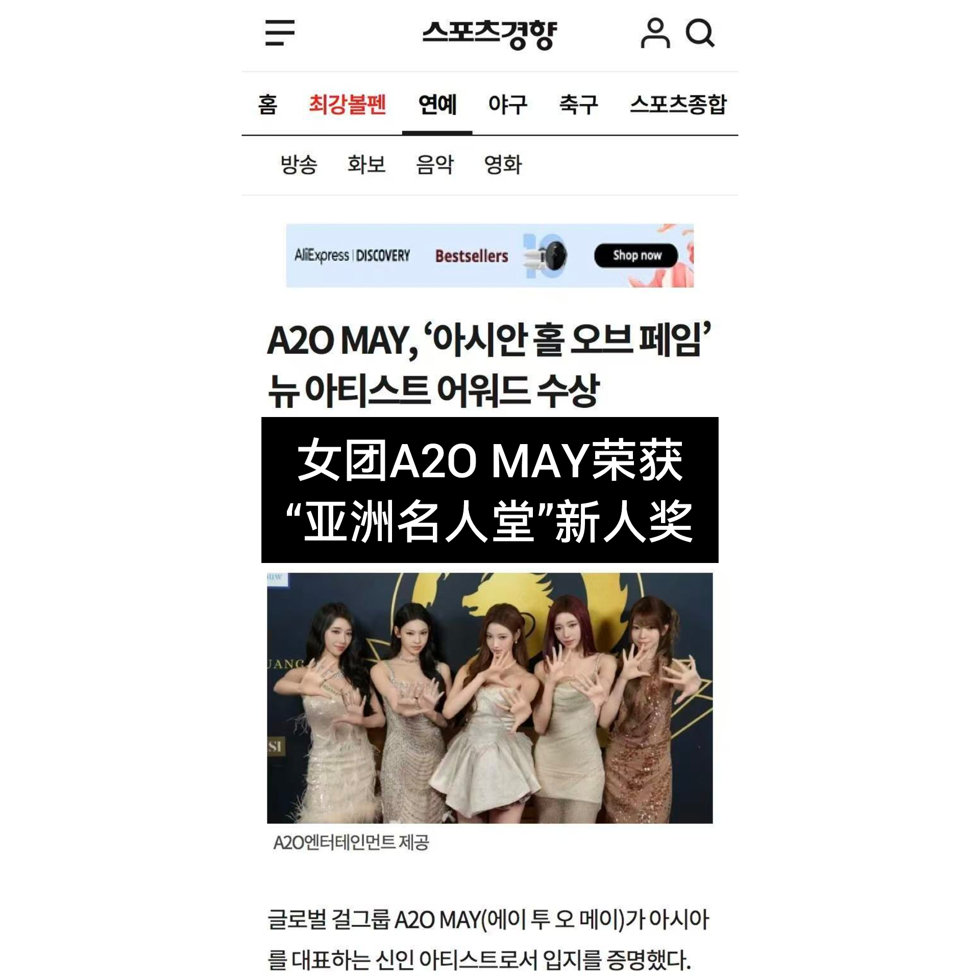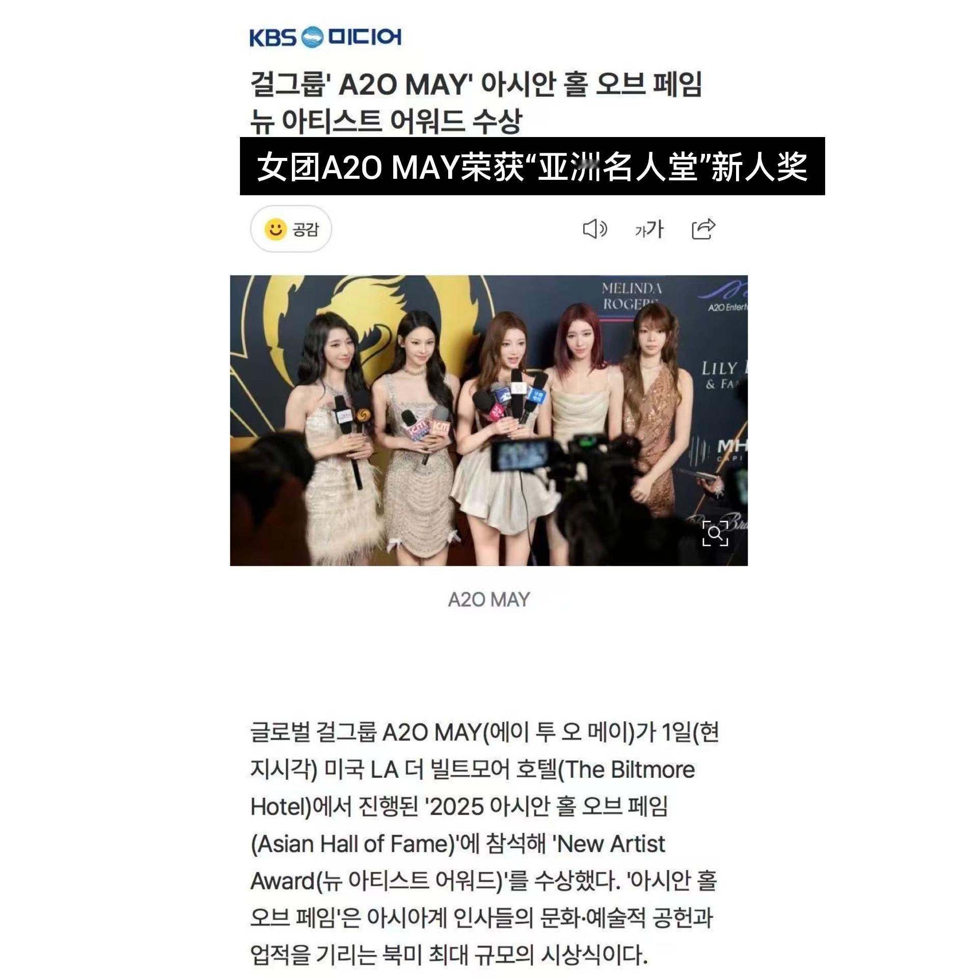A2OMAY拿奖感谢李秀满李秀满成功预测了2025 李秀满企划女子组合 A2O MAY近日荣获“亚洲名人堂(Asian Hall of Fame)”新人奖!据JTBC、KBS等韩国主流媒体报道,女子组合 A2O MAY 于当地时间 11 月 1 日出席了在美国洛杉矶比尔特摩酒店举行的 “2025 亚洲名人堂(Asian Hall of Fame)” 颁奖典礼,并荣获 新人奖 [打call][打call][打call] 继荣获 “2025微博音乐盛典” 年度新锐团体之后,再次摘得“亚洲名人堂”新人奖,充分展现了其作为亚洲新生代代表性女子组合的上升势头,MAY出道后的高人气和强势影响力也引发了韩诸多媒体和粉丝们的热议,成为了近日炙手可热的新女团[good][good][good]