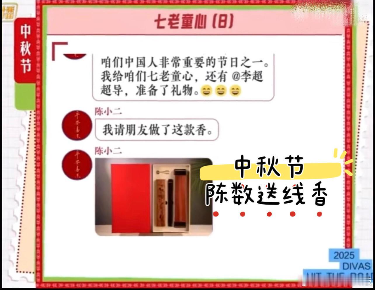 6、中秋节陈数给所有人及导演做了线香当礼物。