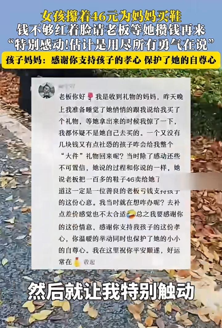 湖北十堰一名小女孩在一家鞋店门口徘徊很久,犹犹豫豫的进也不是退也不舍,最后终于鼓起勇气走进哪家鞋店,支支吾吾的对老板娘说:过几天是她妈妈生日,她想送一双鞋作为生日礼物,有没有她可以买的鞋子,老板娘说:你去看看那一双合适,她低头寻找突然在一双浅黄色的鞋子那里停了下来,多次试穿后非常符合她所认为的合适,于是对老板娘说:我只有46元,这双鞋你能给我留着吗?我还要几天才能攒够买鞋的钱,老板娘被她突如其来的说词惊讶不已,此时她看到小女孩脸色绯红,可能她鼓起了很大的勇气,老板娘略微沉思了一会说道:这鞋子46元也可以卖给你,小女孩非常吃惊的表示:真的吗?老板娘说:是真的,小女孩再三给老板娘说谢谢。 回到家里小女孩的妈妈看到这个礼物,非常感谢女老板的通情达理,把一百多的鞋子46元卖给自己女儿,让她尽一份孝心的同时也保护了她的自尊心,自己预祝女老板事业顺遂,好运常在。 其实如果我是那位母亲会把差价悄悄补上,这样才是最大程度保护自己孩子的自尊心。