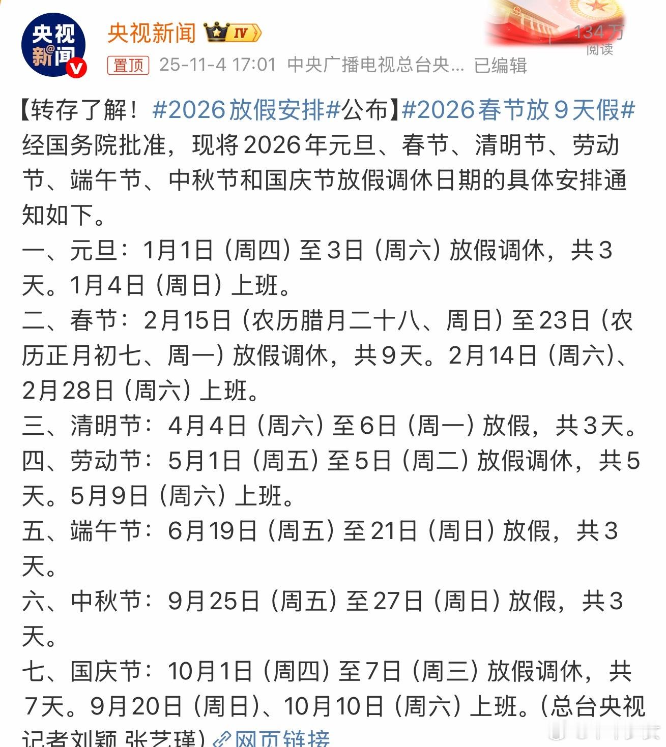 2026春节放9天假太好了是假期消息!再坚持100来天就能喜提长假了!!2026年春节9天假!