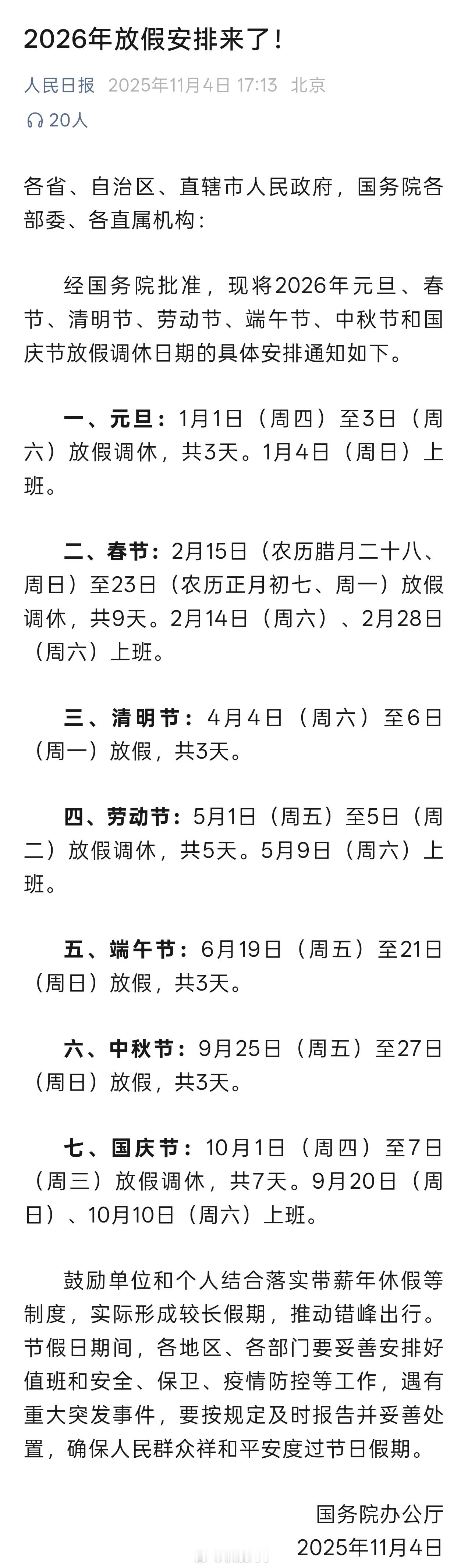 2026年放假安排了,省流版: