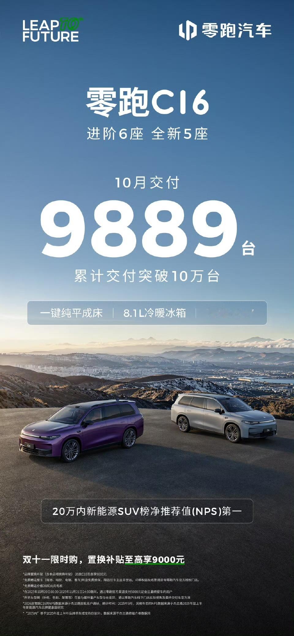 作为新势力第二家盈利品牌,零跑用 65% 自研率筑就护城河,业界首个八合一电驱、率先量产的 CTC 技术,搭配 BBA 级供应链实现成本与品质双控。产品定义更是精准踩中市场需求:10月C10 全球销售超20000台,刷新零跑品牌单车型单月销量纪录,C16 上市 14 个月稳坐 20 万内中大型 SUV 销冠,更稳居该价位新能源 SUV 净推荐值第一,真正做到款款成爆款。零跑C16