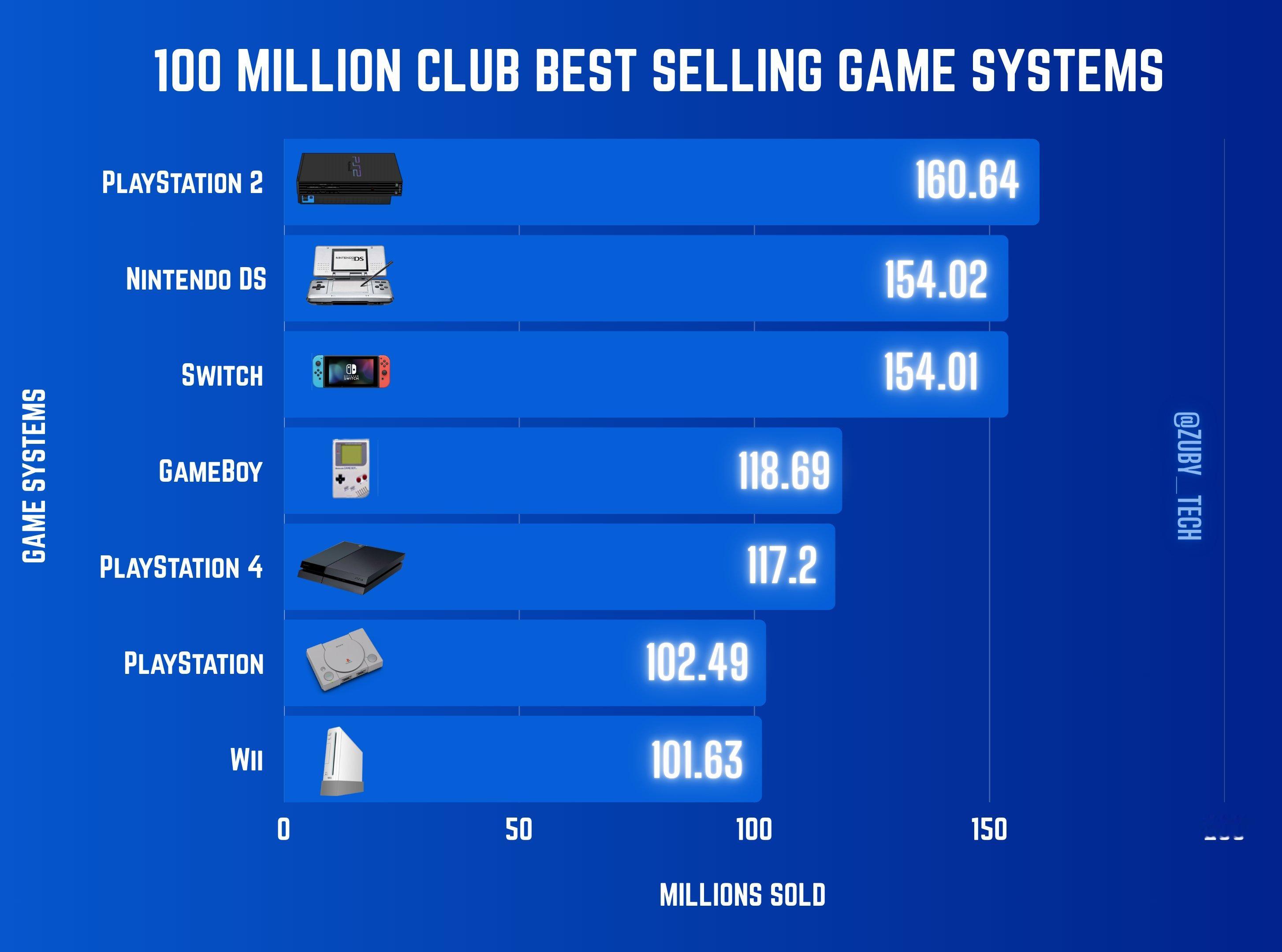 推特网友Zuby_Tech制作了一张游戏机销量图,图上的都是已经卖出超过一亿台的机型,包括今日任天堂财报中1.5401亿台销量Switch。