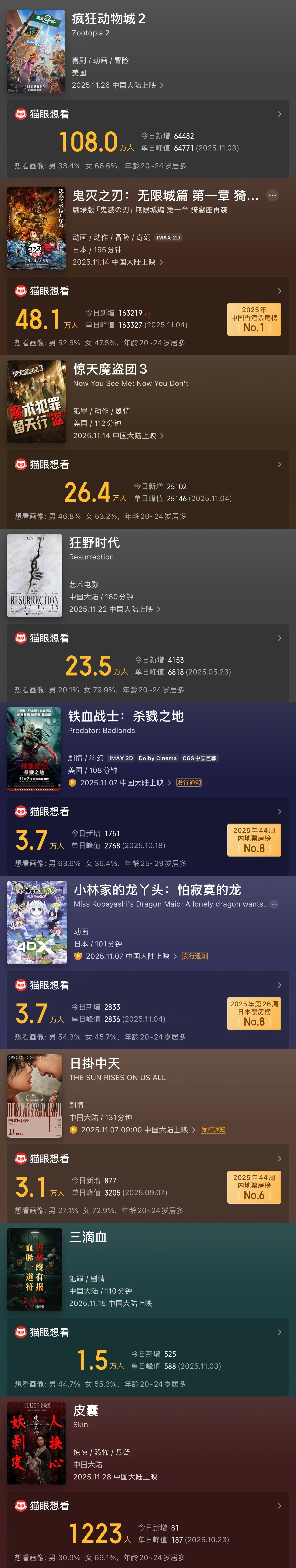 最终还得让动画来扛大旗,《疯狂动物城2》想看达108万,《鬼灭之刃》48.1万,第一名票房10亿起步没问题吧[并不简单]疯狂动物城2电影鬼灭之刃