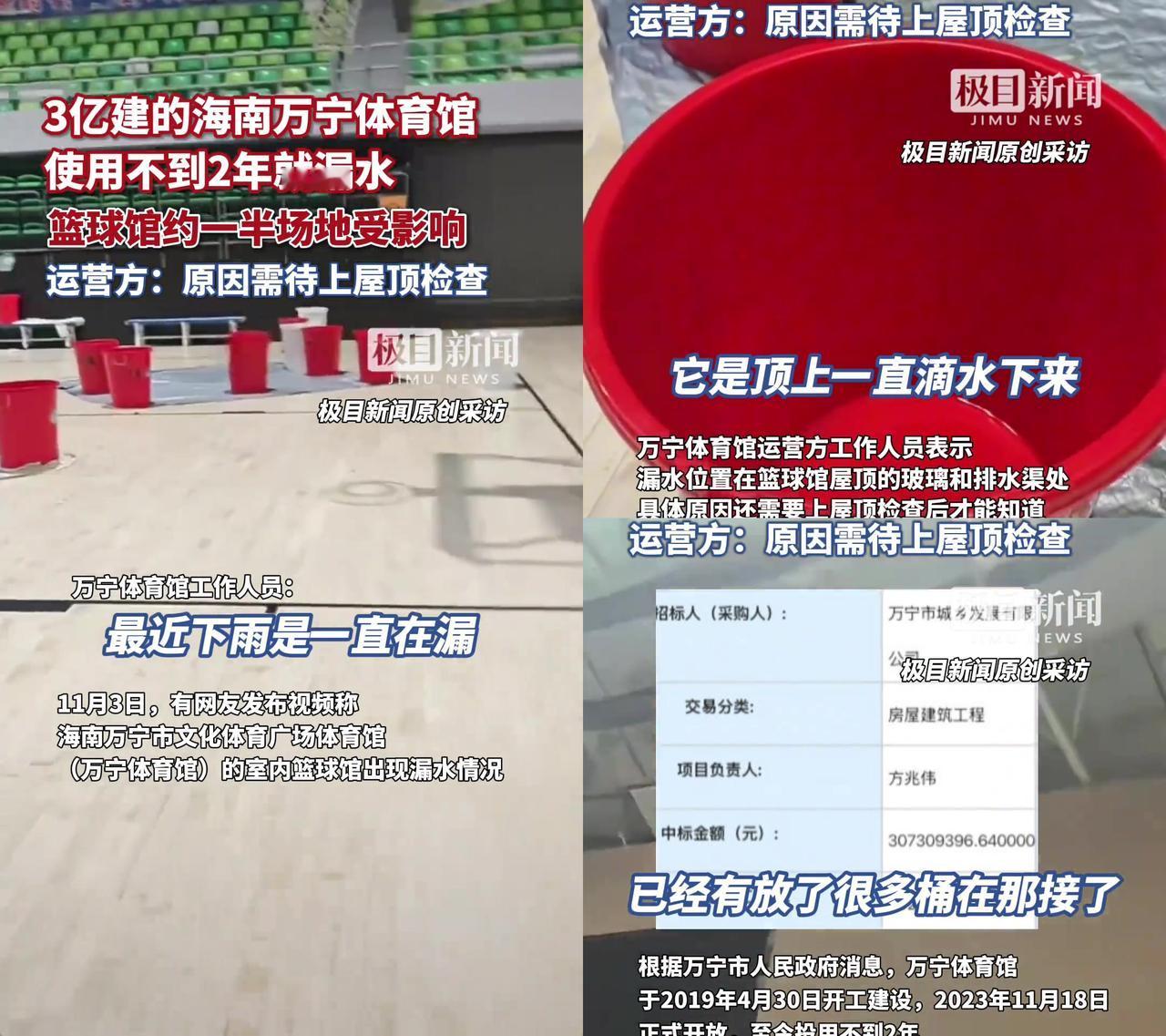 3亿建的万宁体育馆,才用1年多就成水帘洞?大家一句话,比漏水还让人揪心! 据极目新闻采访,最近下雨时屋顶一直滴水,篮球馆一半场地没法用,地上摆了一堆接水桶。 这体育馆2019年开工,2023年开放,造价3亿多,才用不到2年啊! 运营方说要上屋顶查原因,可大家早看清了, 问题不在玻璃没装好,而是有人把工程质量换成了口袋里的钱! 3亿的项目连最基础的排水都做不好? 到底是施工偷工减料,还是监管睁一只眼闭一只眼? 咱们老百姓要的是能放心用几十年的民心工程,而非用两年就坏的豆腐渣! 你觉得这漏水的背后,藏的是技术问题,还是人心问题?
