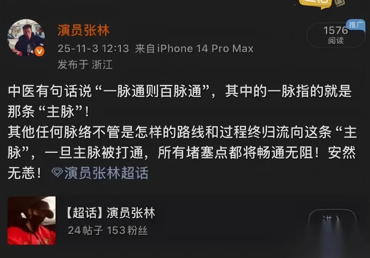 张林一句话炸锅了! 他说的主线到底是什么? 咱就是说,现在好多人做事总爱钻牛角尖,盯着鸡毛蒜皮的小事较劲,结果越忙越乱。演员张林这话真是戳中要害——“一脉通则百脉通”,说白了就是得抓主要矛盾!就像盖房子,先把框架搭稳了,砌砖铺瓦才有条理;职场里净纠结报表格式,不如先明确核心目标;生活中为鸡毛蒜皮吵翻天,不如想想啥才是真正重要的。 总盯着细枝末节,就像在迷宫里绕圈子。张林作为行业清流,敢说大实话才让人服——主线通了,资源、精力都往一处使,难题自然迎刃而解。这道理放哪都适用:团队合作抓核心需求,家庭经营抓感情根基,个人成长抓能力内核。 你觉得张林这话在理不?有没有被琐事绕晕过?来聊聊你最近认准的“主线”是啥?