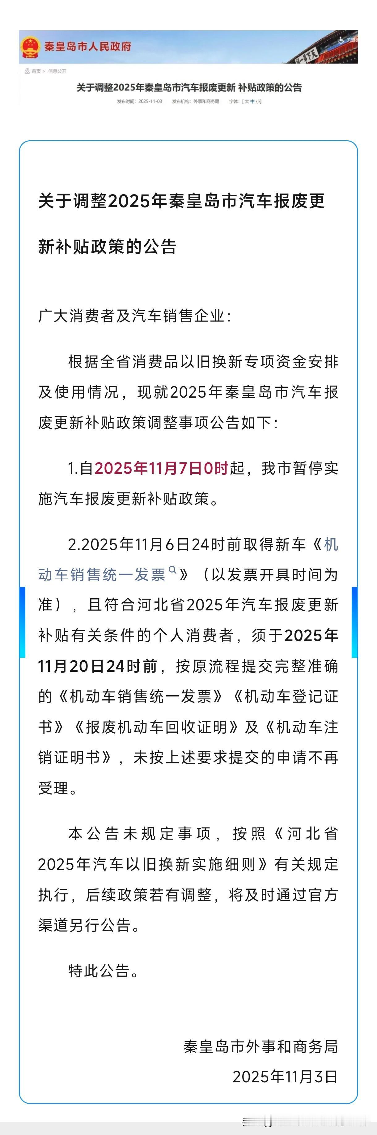 ⚠️2天❗2天❗最后2天❗11月6日24时一到,秦皇岛国补即停❗11月6日前已开新车发票的消费者,请于11月20日24时前提交完整材料,逾期不再受理。 你是否会因为这最后的国补机会而考虑买车呢?欢迎在评论区分享你的看法和决策过程!