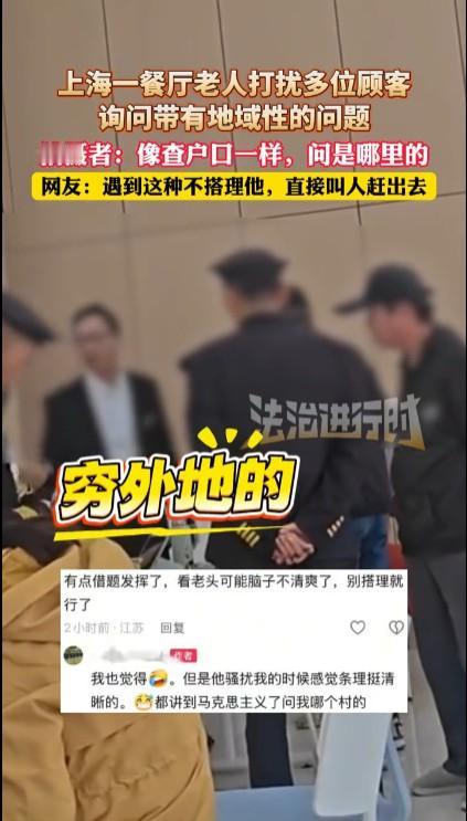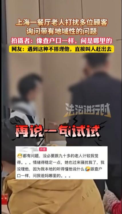 有时过度的自尊也是一种自卑,听不得别人说自己是外地人,或者听到有人说自己是外地人就暴跳如雷的人,往往内心非常在意自己是哪里人。很多上海人看外地人都是乡下人,有一种排外的情绪,这当然不对要改正。但这个老人据说90多岁了,可能思维有些问题,面对这种人的骚扰,有时不理会也是一种态度,没必要像这个年轻人一样又是拍桌子又是砸板凳。很多时候,对一些特别老的人,特别是思维不清的人,忍让一些是比较好的,毕竟人人都有老了甚至不懂事的时候。