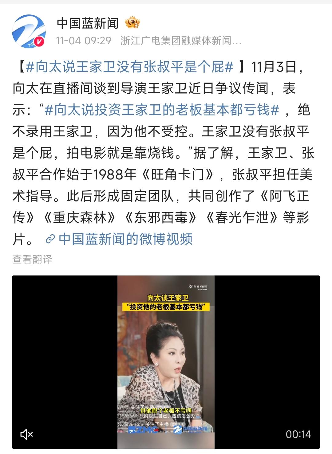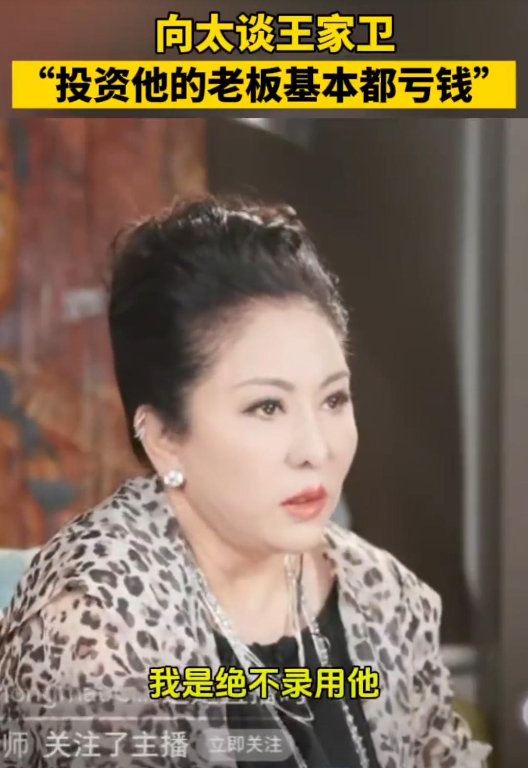 导演王家卫这是“墙倒众人推”了吗? 之前同行爆料出录音来,弄得他里外大花脸。 如今大嘴巴的向太又在直播间里说他,表示什么投资王家卫的老板基本都亏钱,自己绝不录用王家卫,因为他不受控。 还说什么王家卫没有张叔平是个屁,拍电影就是靠烧钱。 我印象中,王家卫的作品,在娱乐圈里还是很有“格调”的,很多人都吹捧过他的电影,很多明星也都上赶着和他合作。 怎么这次几年不见,王家卫就成这样了?