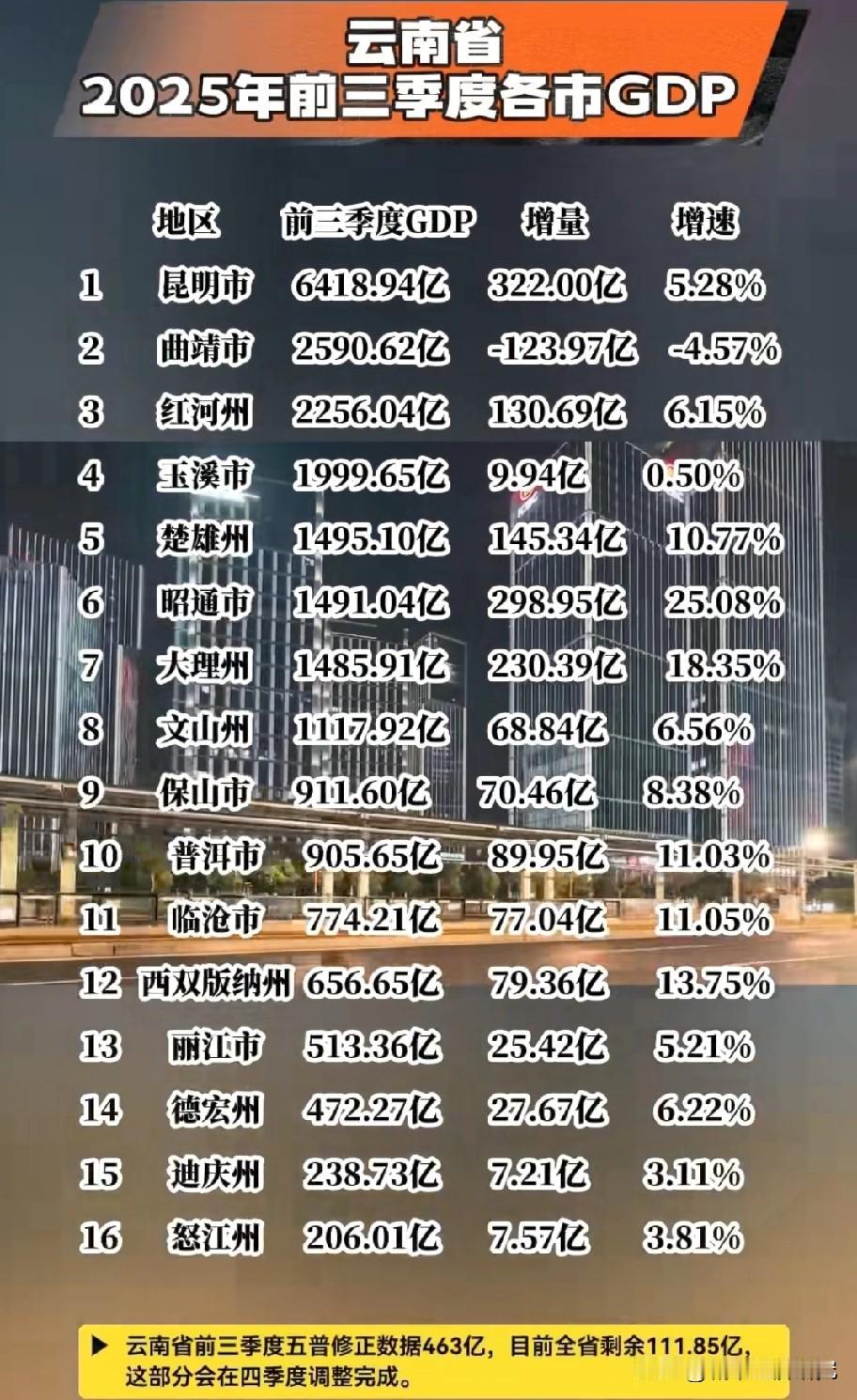 云南省2025年前三季度各城市经济发展水平情况,云南省会城市昆明前三季度GDP增量最高,昆明市前三季度GDP增量达到了322亿元人民币,从图片数据能够看出云南省前三季度大部分城市经济都能够保持正增长,仅有一个城市前三季度经济出现了负增长,所以经济出现负增长的这座城市需要努力加油了。