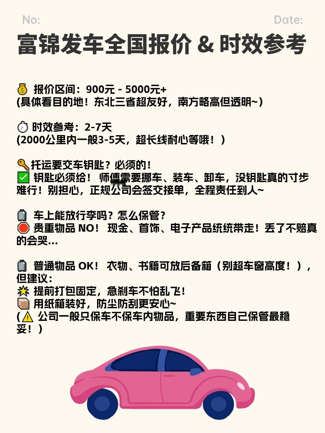 🔥 黑河发全国,报价&时效一览 💰 报价区间:1000元-7000元+ (具体看路线、车型、季节!偏远地区会高些) ⏱ 时效参考: 东三省/内蒙:3-7天 北上广深等一线:7-15天 西藏/新疆等偏远:15天+ ❓ 全是直发线路? 不一定! 大部分热门城市(如北上广)可直发,但偏远地区(如西藏、青海)可能需中转,时效会延长。签约前务必确认路线方案! 🚫 车辆会被扣押滞留吗? 正规公司绝不会! 但注意: 1️⃣ 证件不全:行驶证/身份证复印件缺一不可! 2️⃣ 车内违禁品:打火机、锂电池、易燃品必须清空! 3️⃣ 非法车辆:走私车、改装车等无法托运! 📌 托运避坑必看 ✔️ 选有资质+保险的公司(合同写明“车损险”) ✔️ 交车前360度录像,留存车辆状况 ✔️ 贵重物品随身带,后备箱只放普通行李 ✔️ 到车后当场验货,有问题立即拒收并取证! 💡 小贴士 旺季(如春节、暑假)提前7天预约!黑河发南方建议选封闭车厢,避免雨雪沙尘~