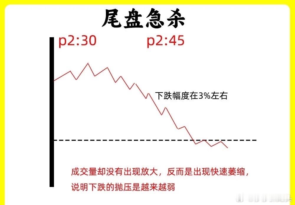 股价在长期下跌以后的低位或是股价长期的低位横盘的阶段。股价在尾盘的三十分钟里,尤其是最后十分钟,股价突然开始大幅急跌,出现跳水的情况,下跌幅度在3%左右,但是此时成交量却没有出现放大,反而是出现快速萎缩,说明下跌的抛压是越来越弱。整个跳水的过程里,都没有跌破下方的支撑位,那往往这样的尾盘急跌是主力的洗盘,所以我们要分清楚是洗盘和真跌的区别。成交量和支撑位是关键