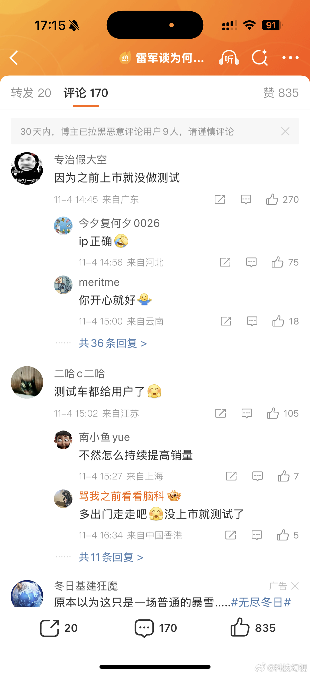 雷军谈为何小米汽车持续进行车辆测试持续进行车辆测试就等于上市前没测?就是测试车都给用户了?脑子怎么长的[允悲]