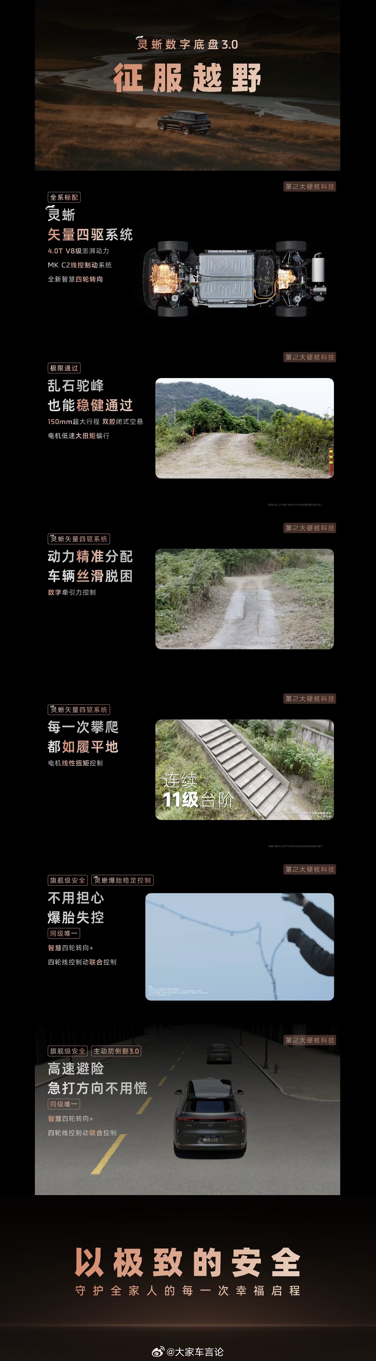 新车尺寸5279mm x 2000mm x 1806mm,轴距3160mm,采用六座布局。全系搭载520线超视域激光雷达最远300m有效感知。4D机械按摩座椅,副驾+二排共三座零重力座椅,27.1英寸5K臻彩驾舱屏+15.6英寸副驾屏+21.5英寸4K二排娱乐屏,配合B&O殿堂级音响舒适性直接拉满。