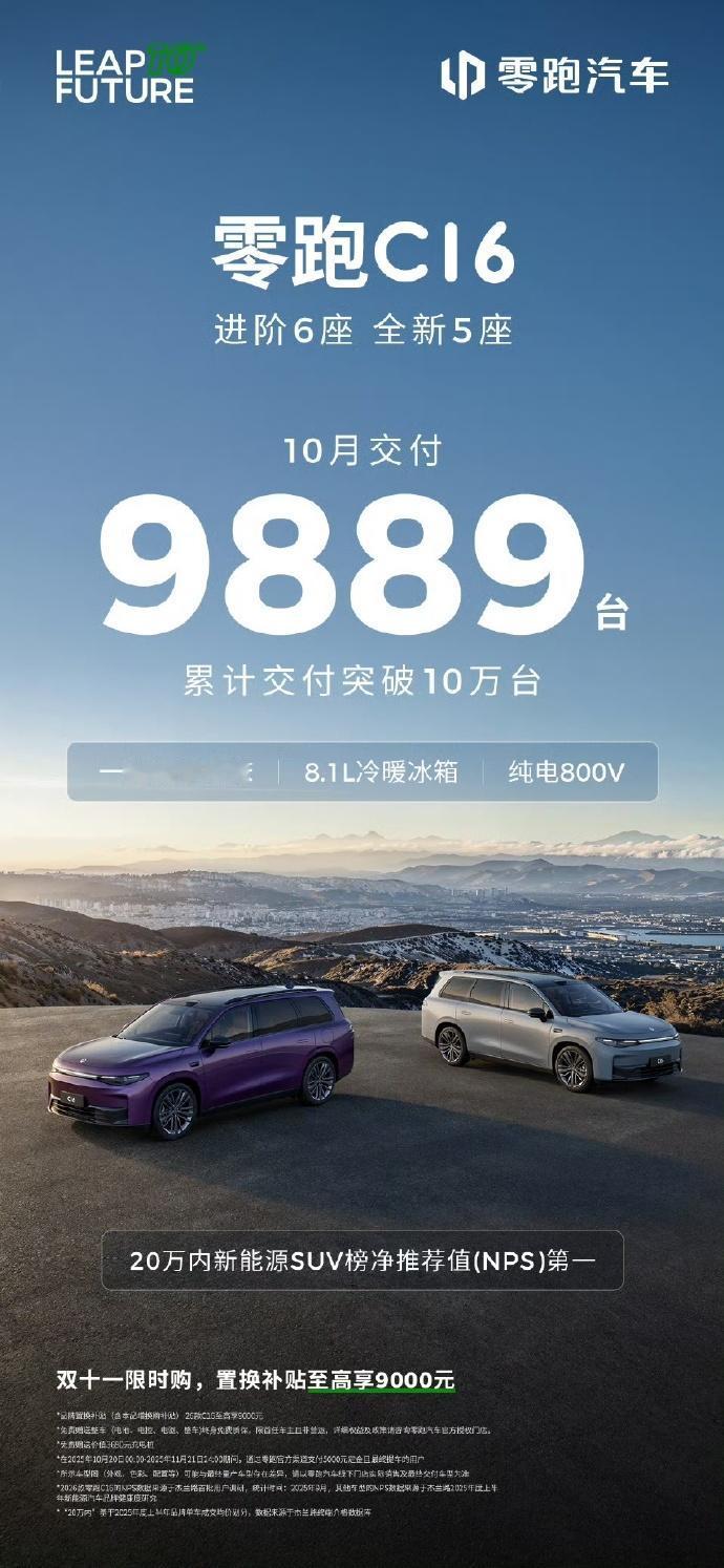 零跑 C16 最近挺猛,10 月交付 9889 台,累计交付直接突破 10 万大关。在 20 万内新能源 SUV 里,它的净推荐值(NPS)还拿了第一。 说到底,它的 “一键纯平成床”“8.1L 冷暖冰箱” 这些配置很贴家用场景,纯电 800V 架构也没落下技术节奏。这种交付增长不只是零跑自己的突破,也说明 20 万级新能源市场,用户越来越吃 “配置实用 + 价格亲民” 这套,其他品牌可得好好参考参考了。