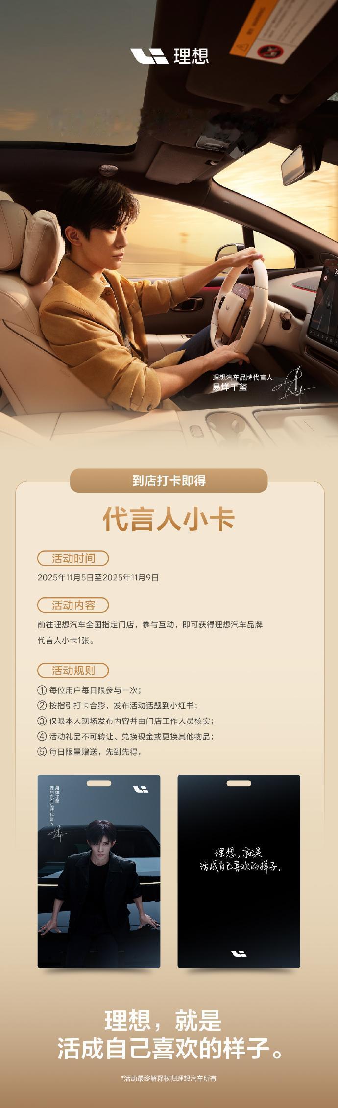 到所在城市的指定理想汽车门店,参与打卡就可以获得理想汽车代言人易烊千玺 和理想汽车送出的限定小卡一张,看来门店又要被挤爆了