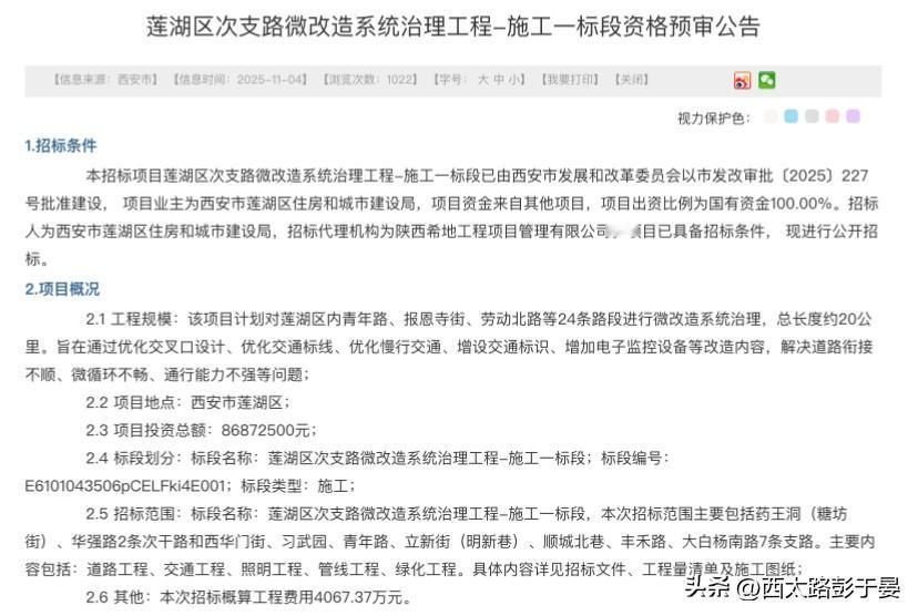 西安莲湖区24条路段将微改造!涉及青年路、丰禾路等,总投资超8600万 西安莲湖区交通要升级啦!近期,莲湖区次支路微改造系统治理工程启动相关招标,多项重点内容关乎居民出行。 据悉,此次工程计划对区内青年路、报恩寺街、劳动北路等24条路段进行微改造,总长度约20公里。改造将聚焦道路衔接不顺、微循环不畅等问题,通过优化交叉口设计、交通标线,完善慢行交通,增设交通标识和电子监控设备,提升通行效率。 其中,施工一标段已经开始招标,涉及9条路段,大家要留意:药王洞(糖坊街)、华强路这2条次干路,还有西华门街、习武园、青年路等7条支路。改造内容很全面,不光修路面,还会完善交通设施、装路灯、整理管线,甚至会种些绿植美化环境。整个项目总投资8687.25万元,光这次招标的标段概算工程费用就有4067.37万元。 期待改造完成后,莲湖区的出行环境能更顺畅,居民日常通勤更便捷!